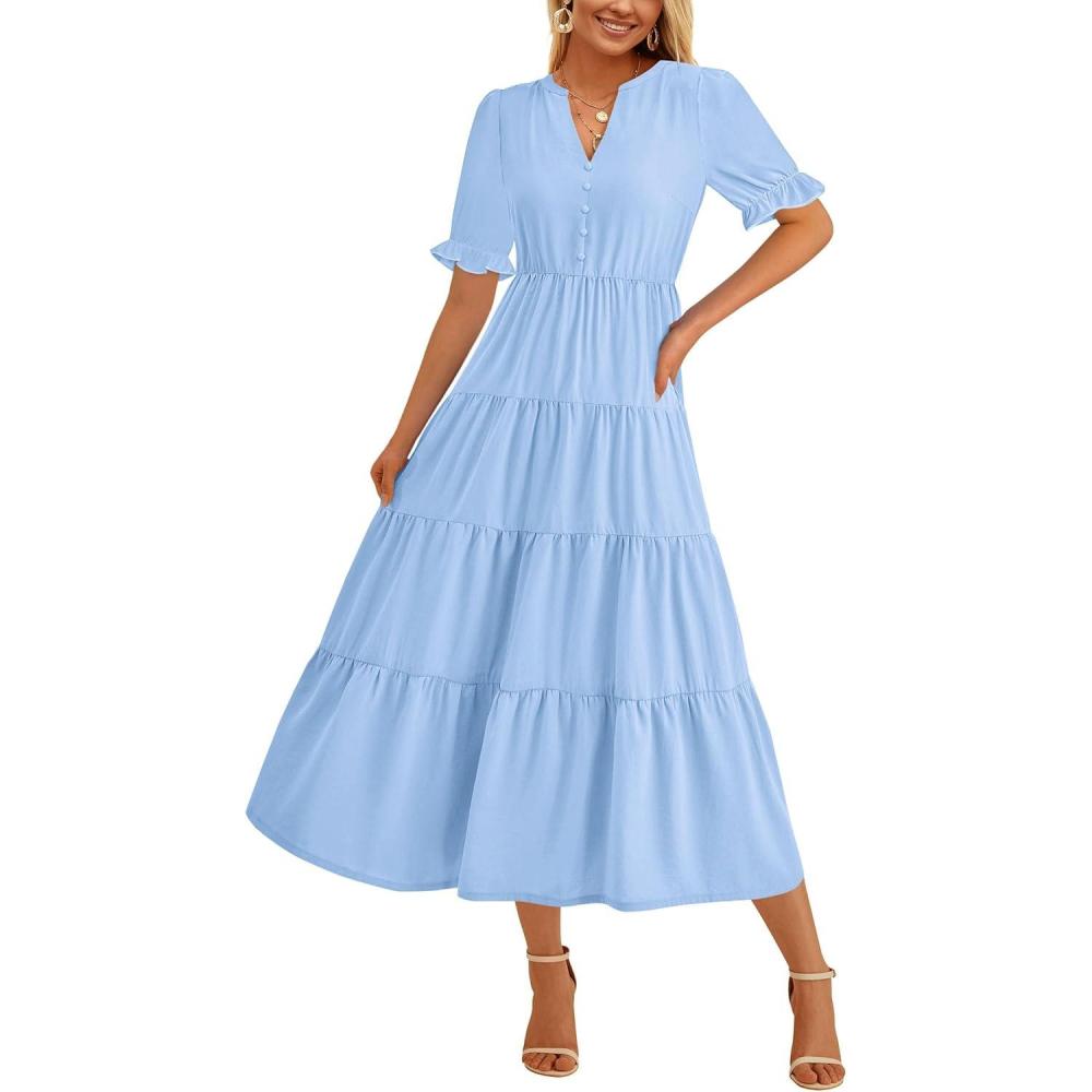 PRETTYGARDEN Women's Summer Casual Short Sleeve V Neck Midi Dresses 2025 Spring A-line Tiered Wedding Guest Dress(Light Blue)