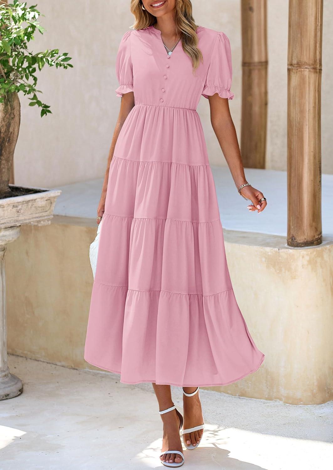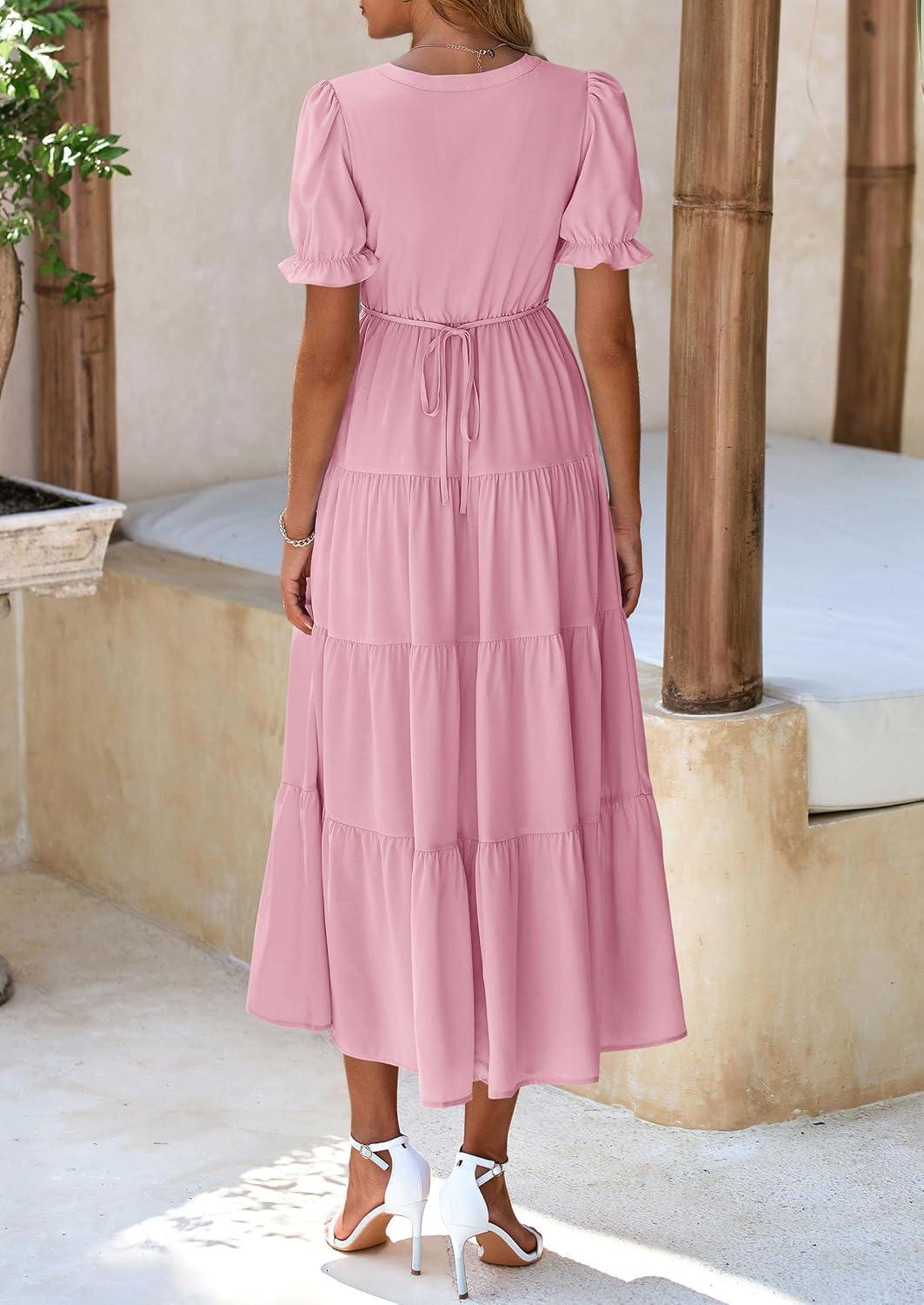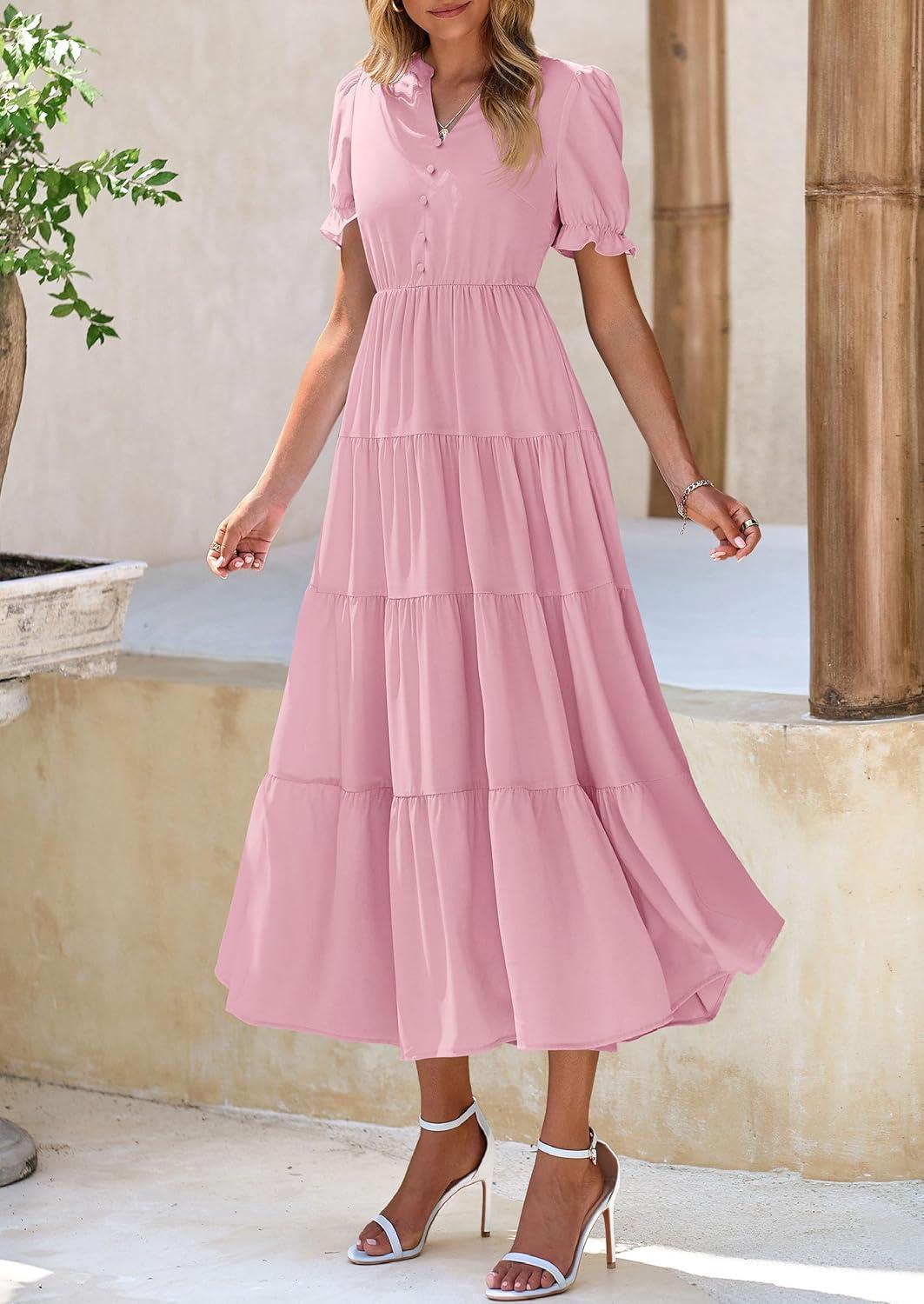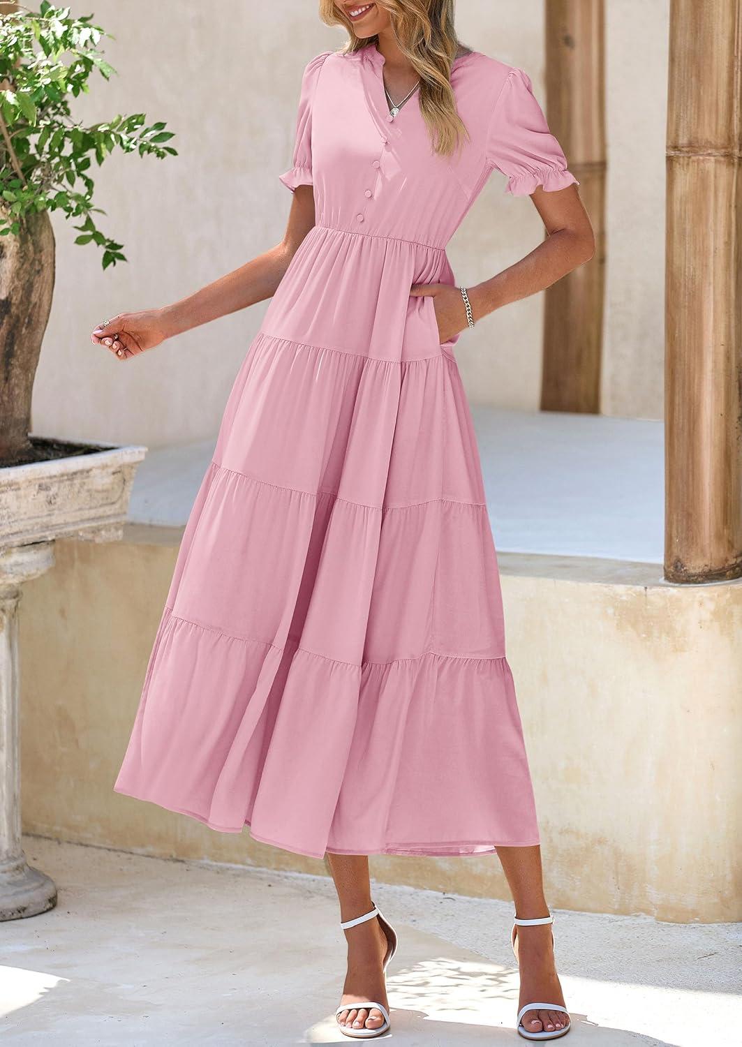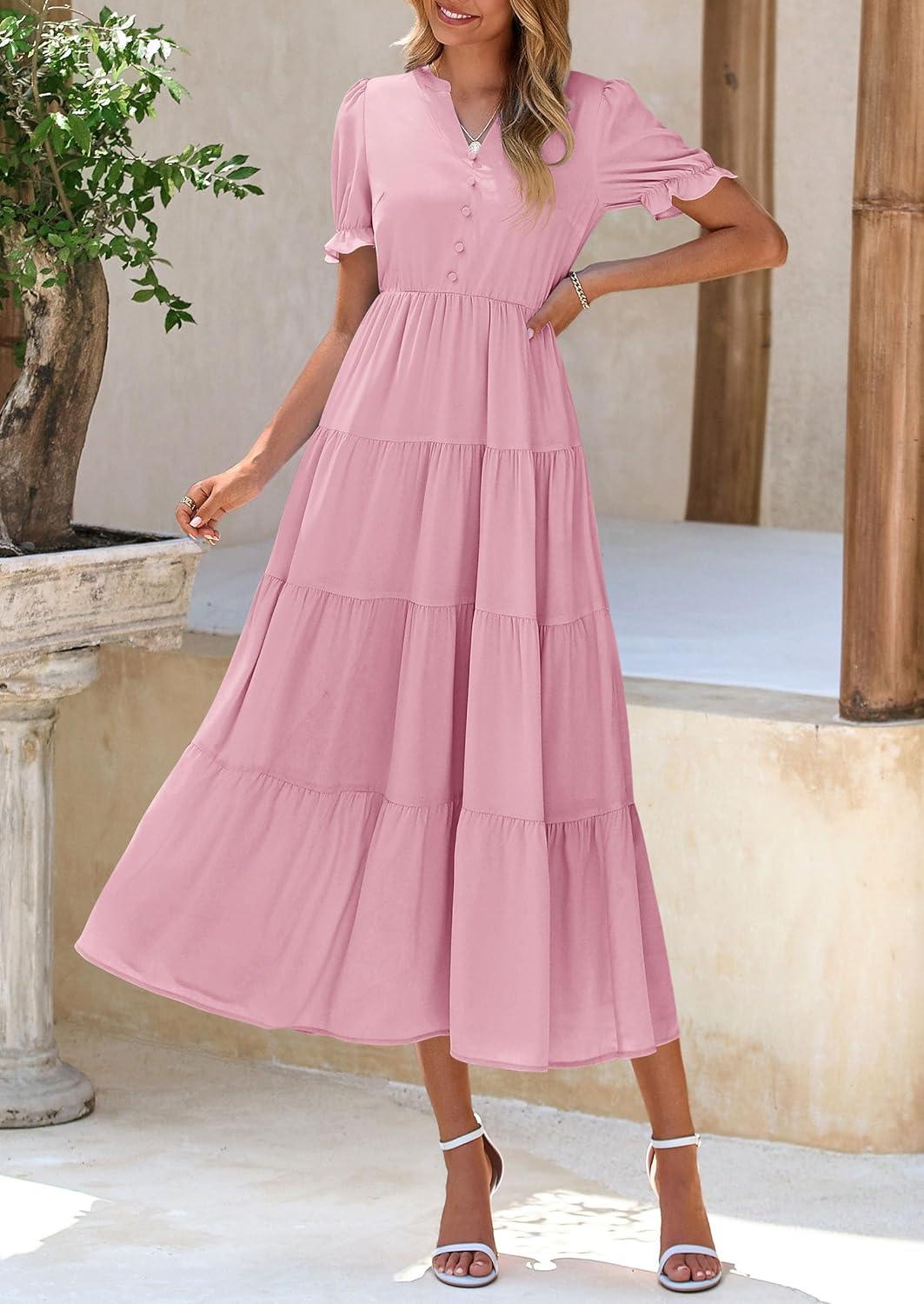 PRETTYGARDEN Women's Summer Casual Short Sleeve V Neck Midi Dresses 2025 Spring A-line Tiered Wedding Guest Dress(Pink)