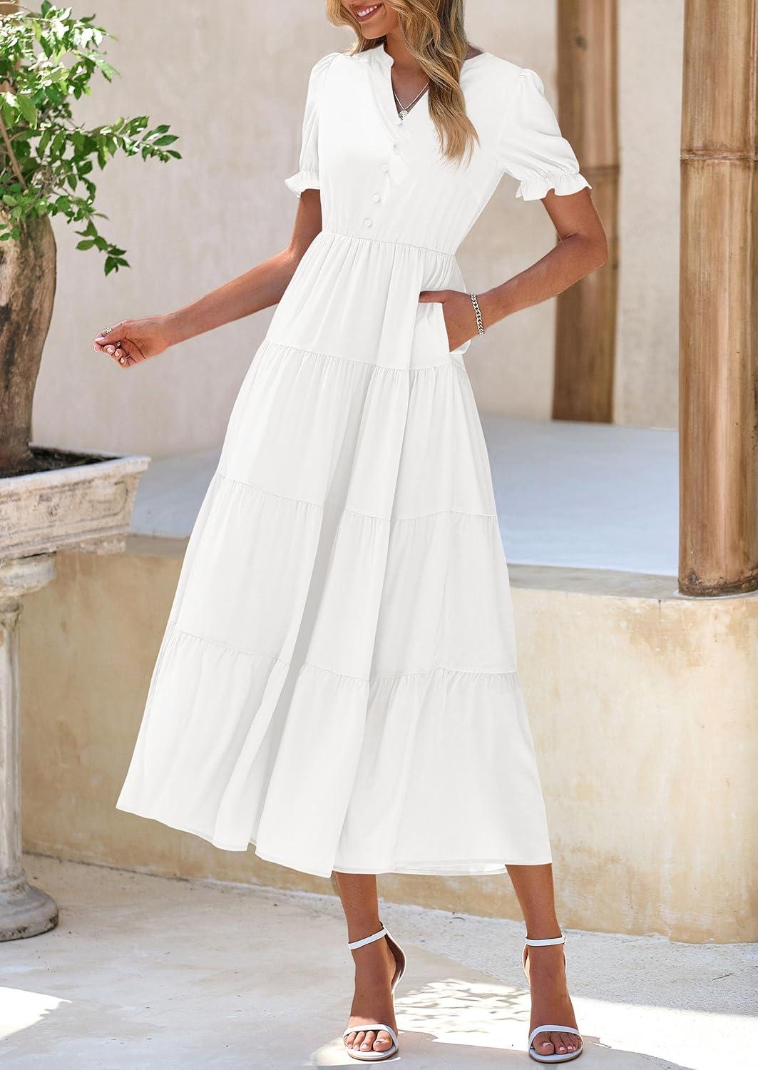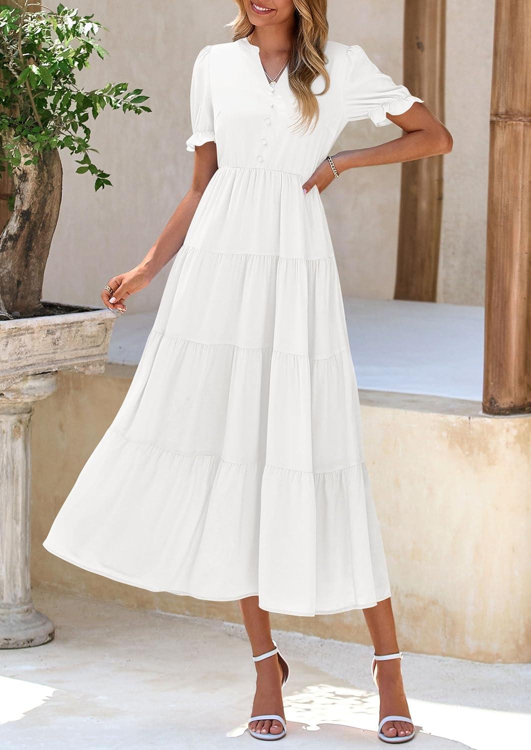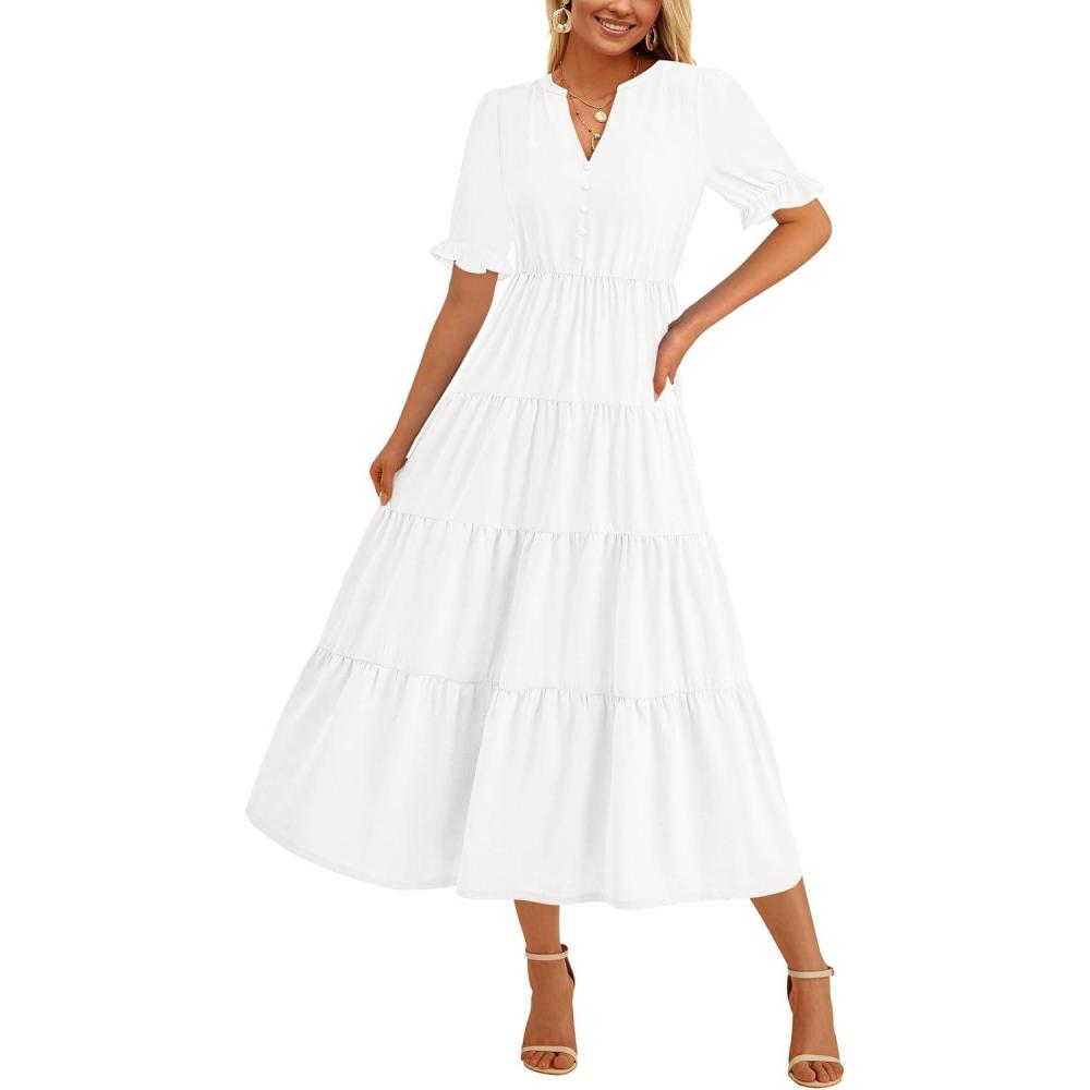 PRETTYGARDEN Women's Summer Casual Short Sleeve V Neck Midi Dresses 2025 Spring A-line Tiered Wedding Guest Dress(White)