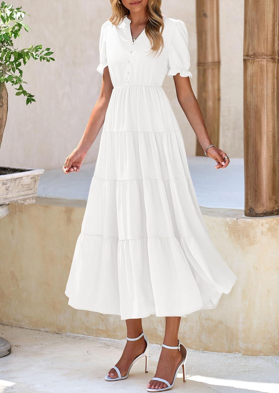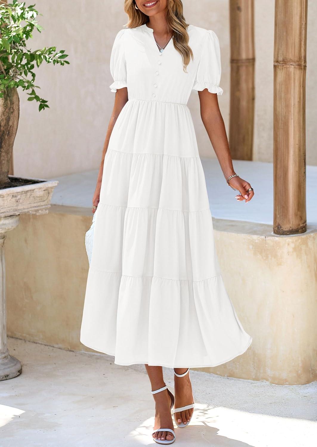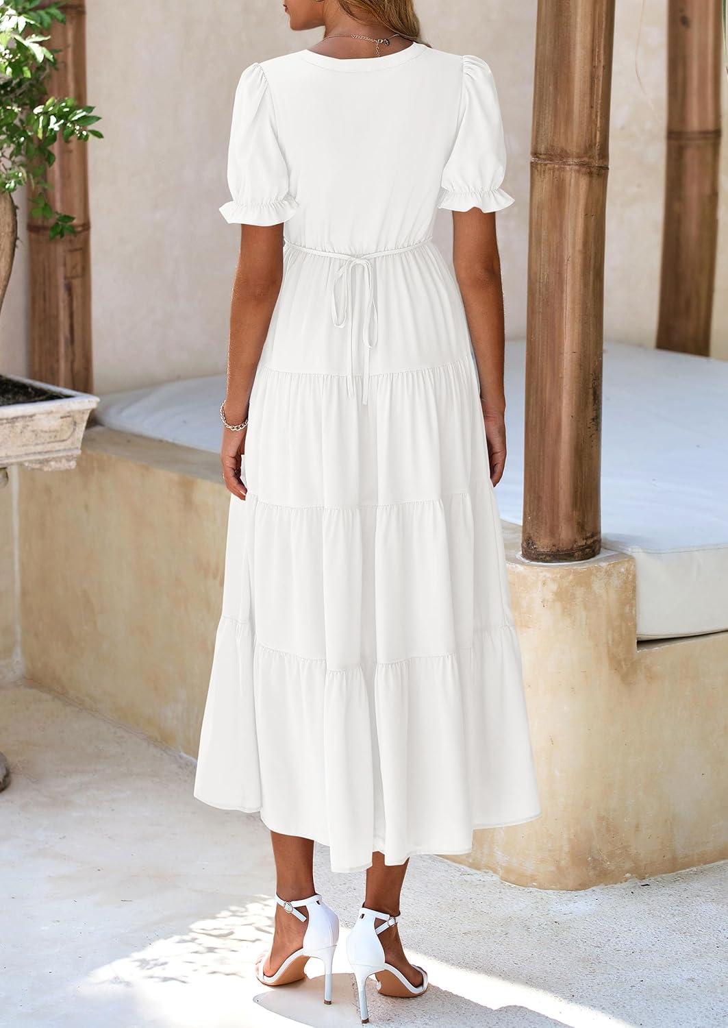 PRETTYGARDEN Women's Summer Casual Short Sleeve V Neck Midi Dresses 2025 Spring A-line Tiered Wedding Guest Dress(White)