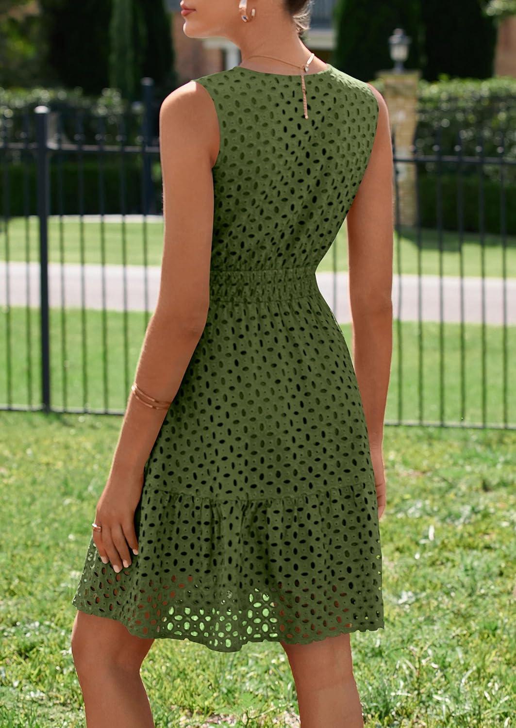 PRETTYGARDEN Women's Summer Dresses 2025 Sleeveless V Neck Eyelet Hollow Out Swing A Line Beach Vacation Sun Dress(Army Green)