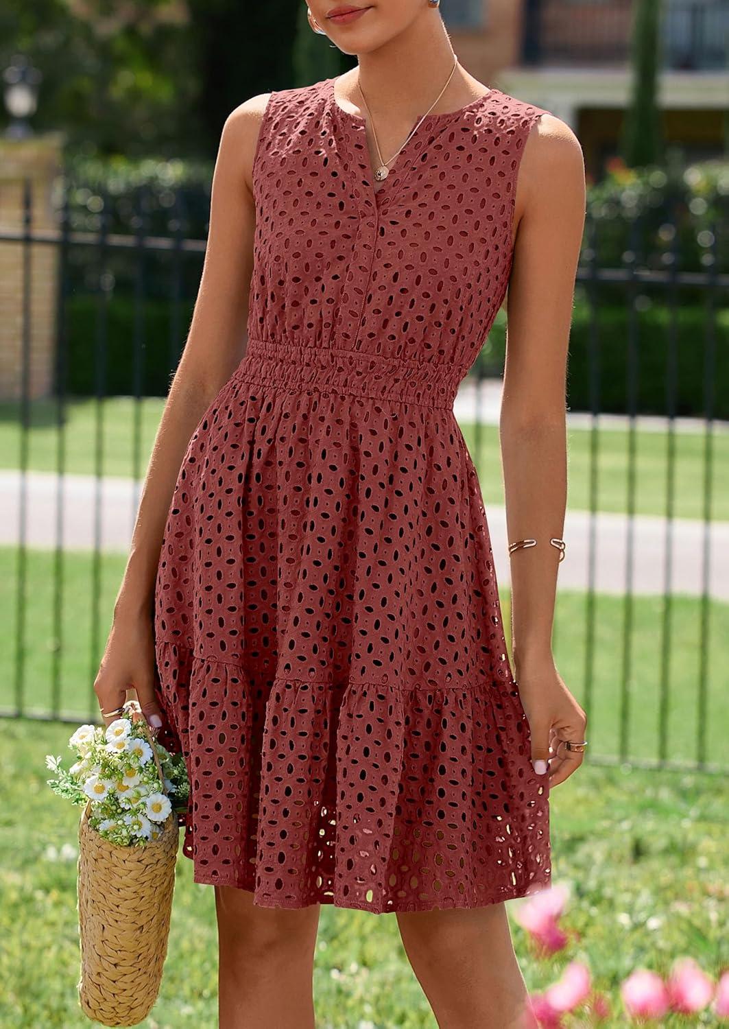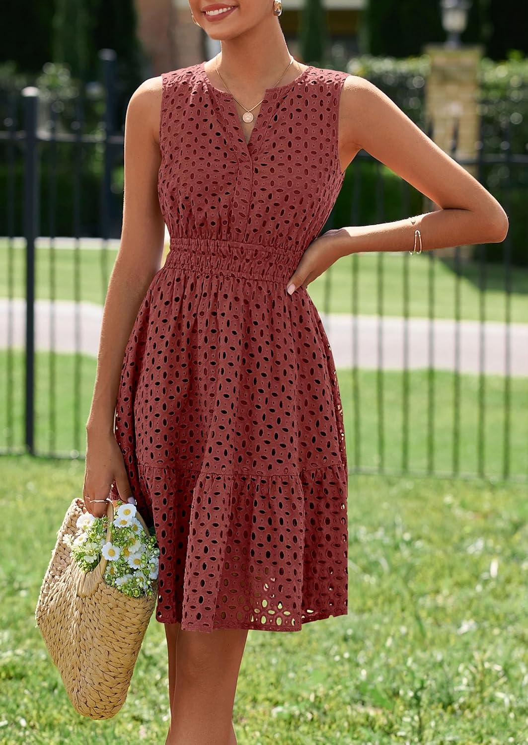 PRETTYGARDEN Women's Summer Dresses 2025 Sleeveless V Neck Eyelet Hollow Out Swing A Line Beach Vacation Sun Dress(Brown)