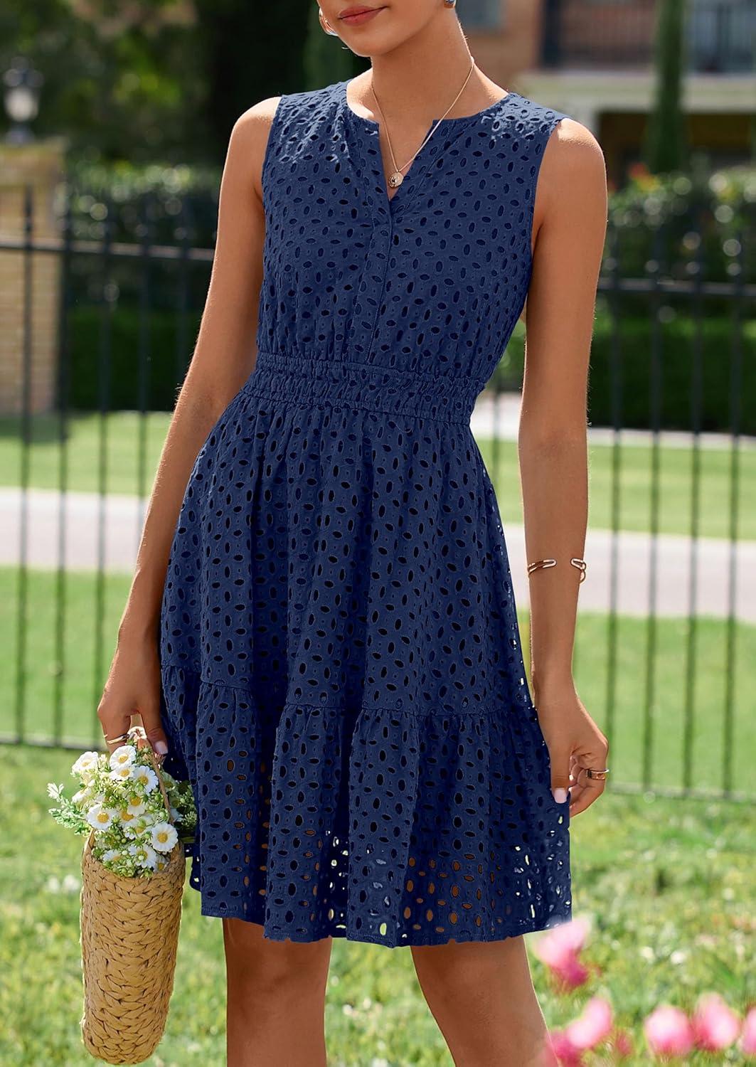 PRETTYGARDEN Women's Summer Dresses 2025 Sleeveless V Neck Eyelet Hollow Out Swing A Line Beach Vacation Sun Dress(Navy)