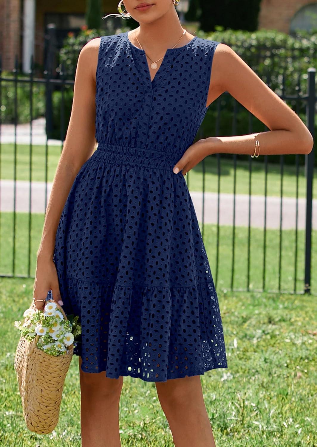 PRETTYGARDEN Women’s Summer Dresses 2025 Sleeveless V Neck Eyelet Hollow Out Swing A Line Beach Vacation Sun Dress(Navy)