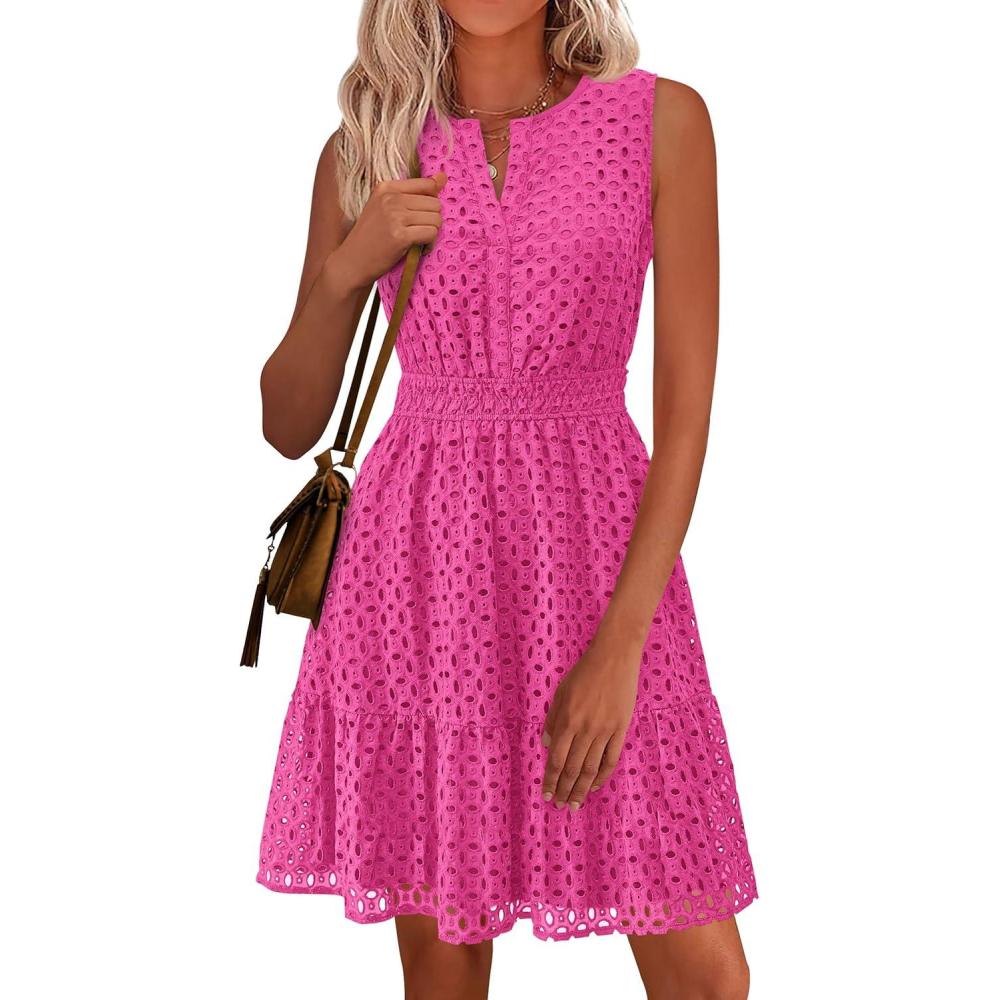 PRETTYGARDEN Women’s Summer Dresses 2025 Sleeveless V Neck Eyelet Hollow Out Swing A Line Beach Vacation Sun Dress(Pink)