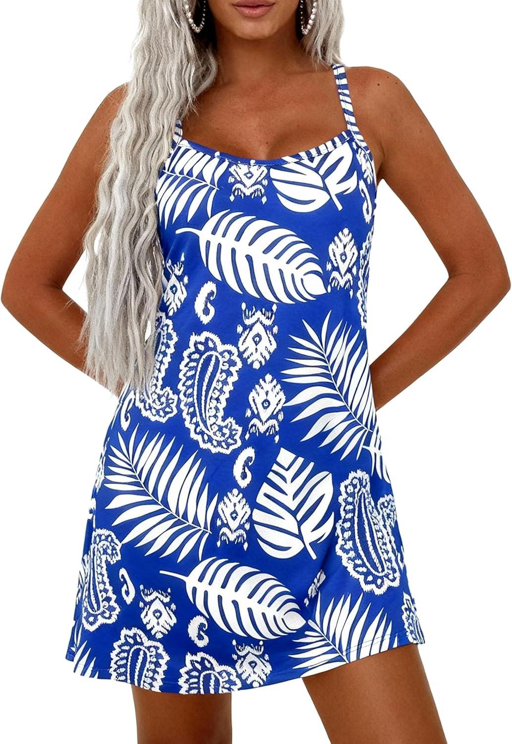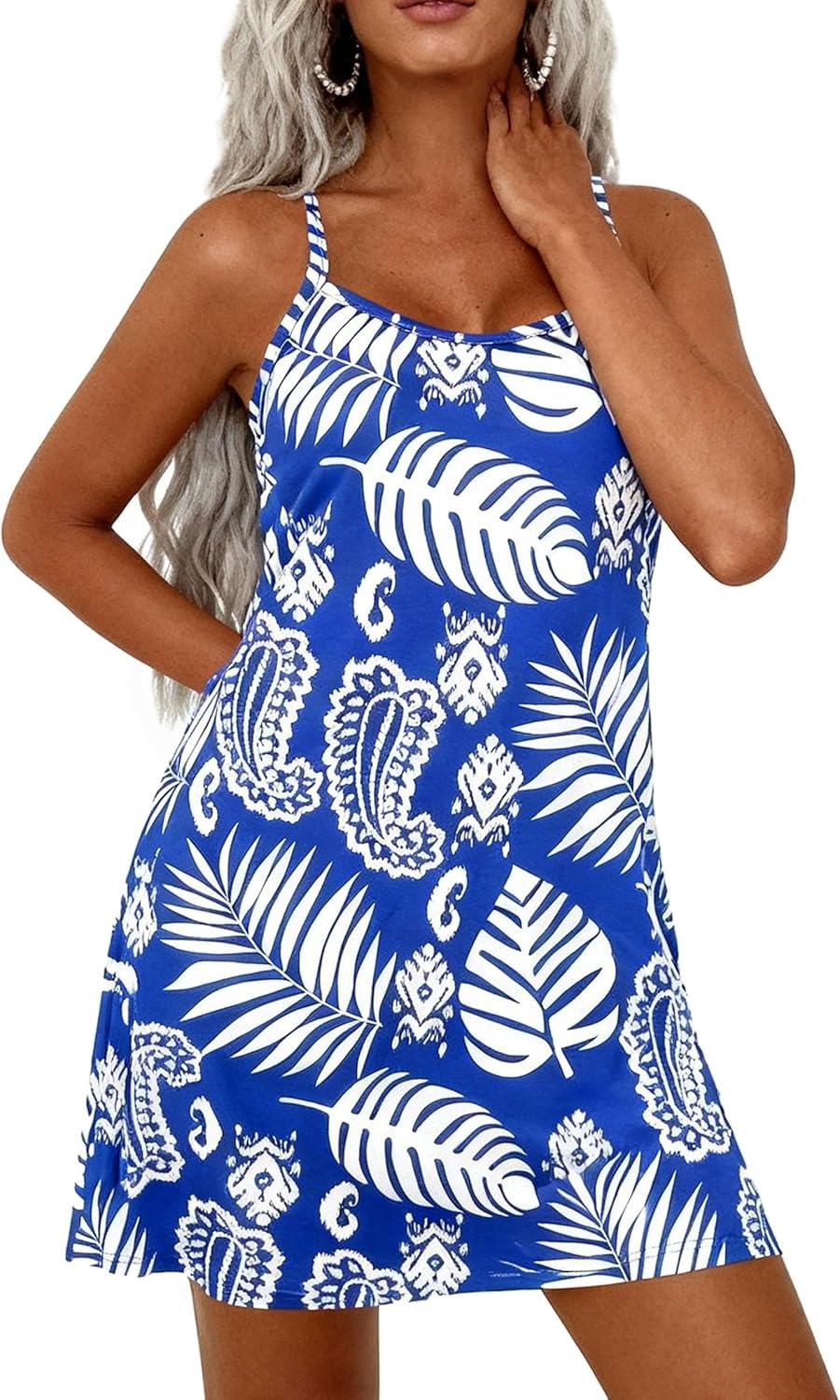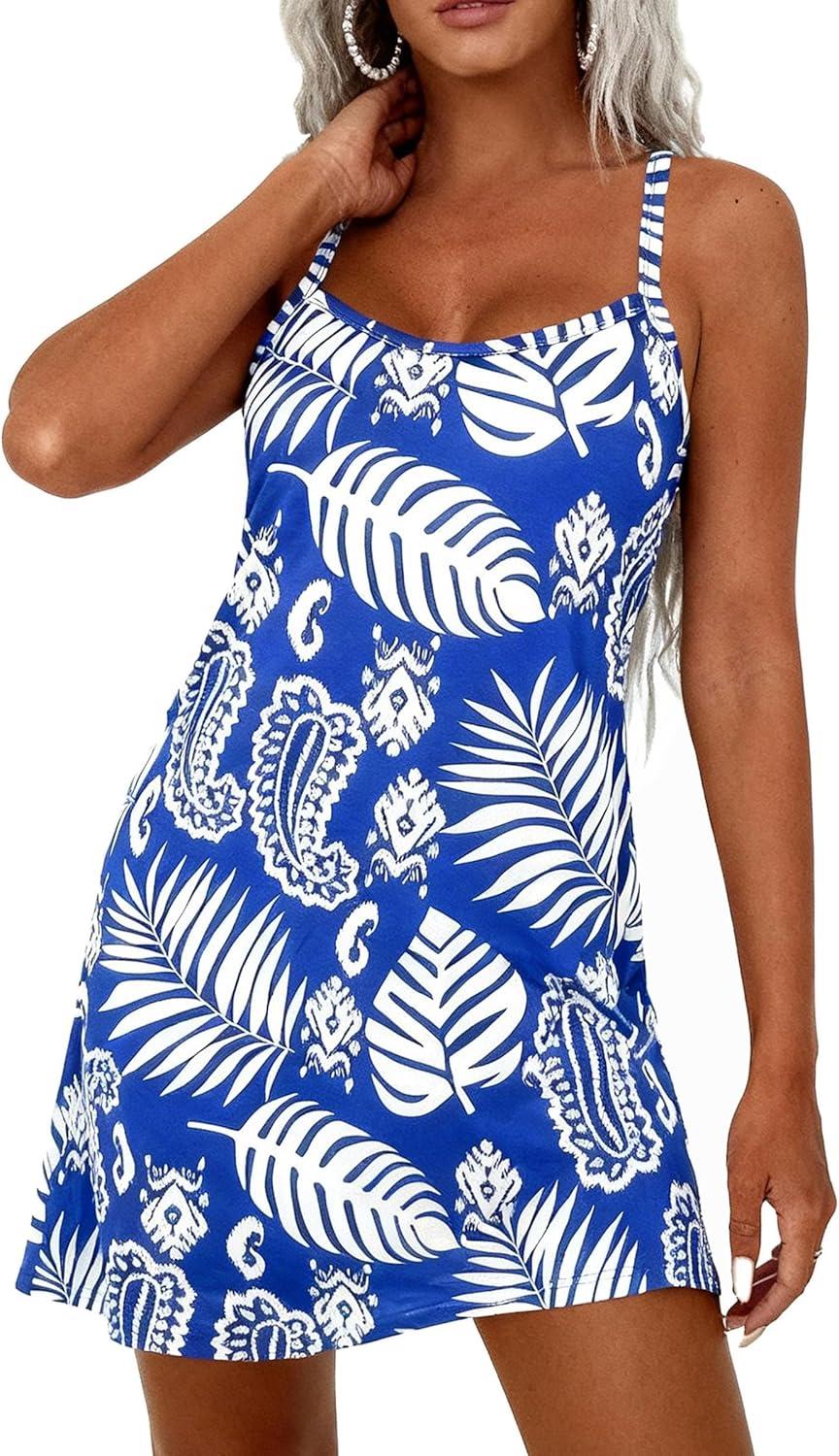 PRETTYGARDEN Women's Summer Dresses 2026 Casual Print Spaghetti Strap Sleeveless Sundress Beach Vacation Cover Ups(Blue)