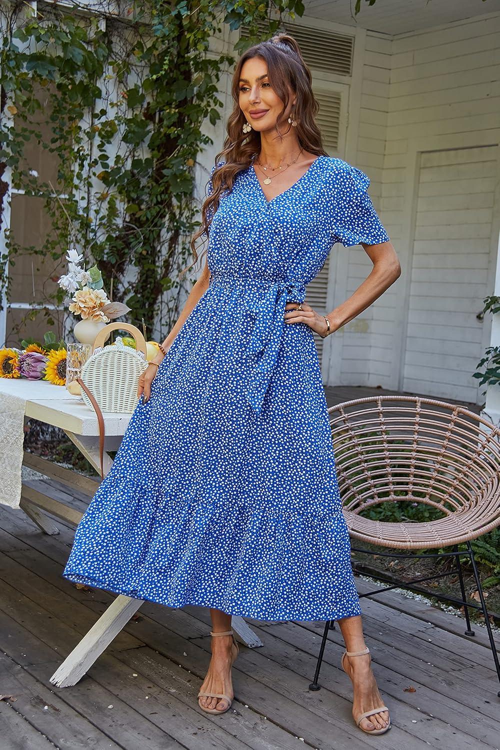 PRETTYGARDEN Women's Summer Floral Boho Maxi Dress Wrap Short Sleeve V Neck Ruffle A-Line Flowy Wedding Guest Long Dresses(Blue Floral)