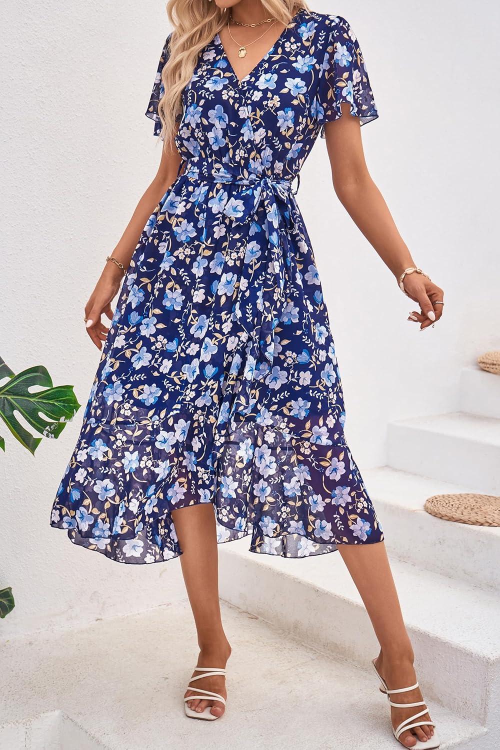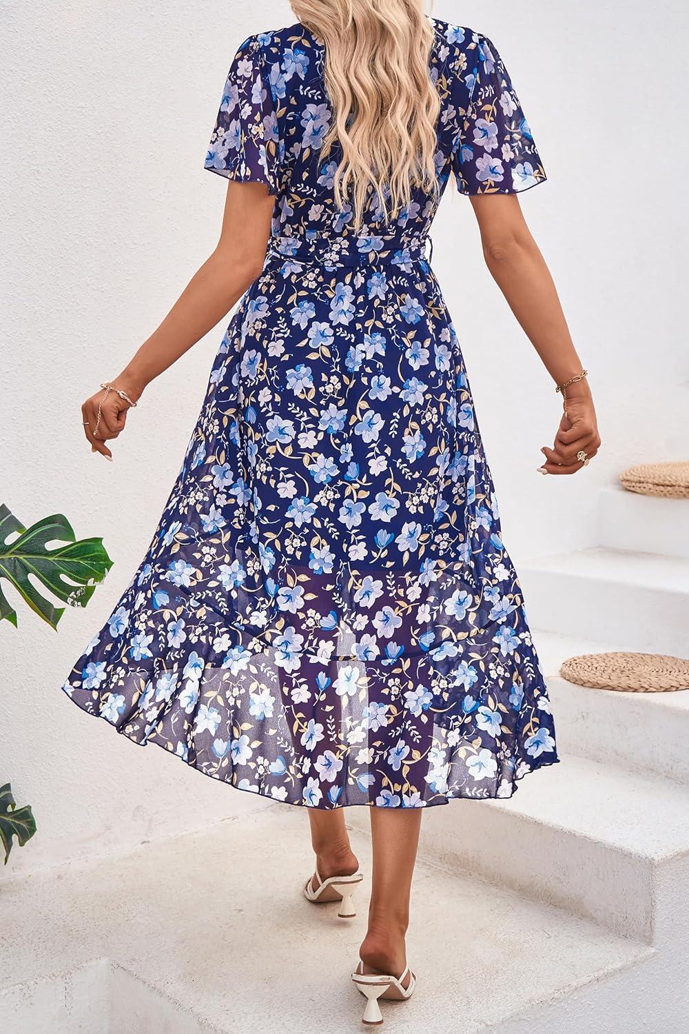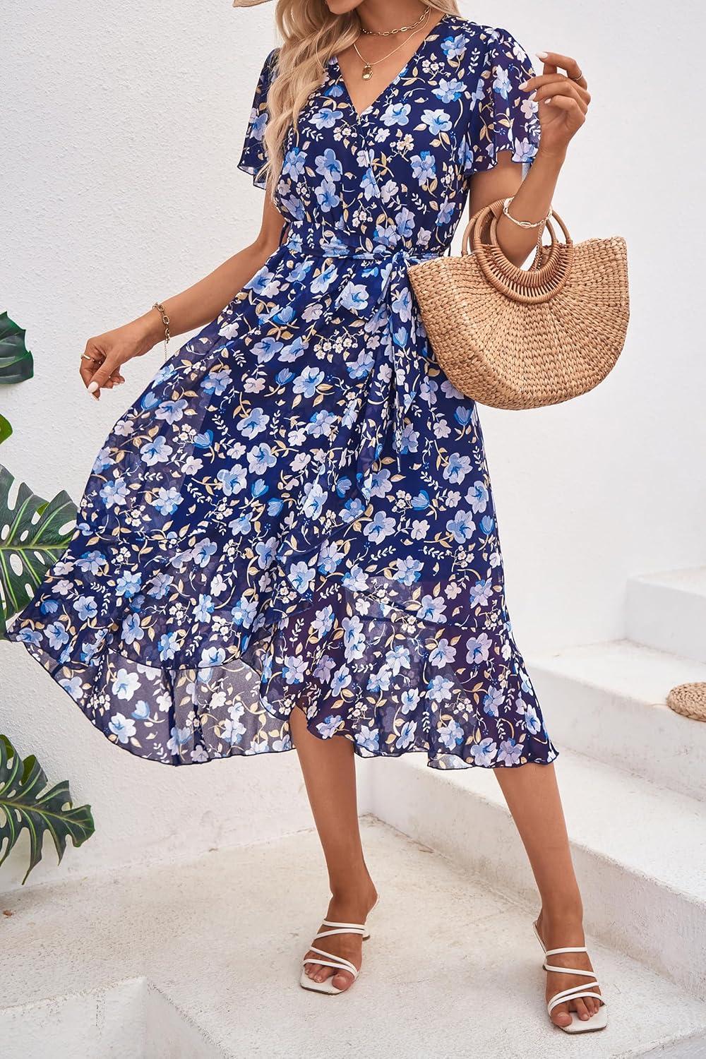 PRETTYGARDEN Women's Summer Floral Boho Maxi Dress Wrap Short Sleeve V Neck Ruffle A-Line Flowy Wedding Guest Long Dresses(Navy White Floral)