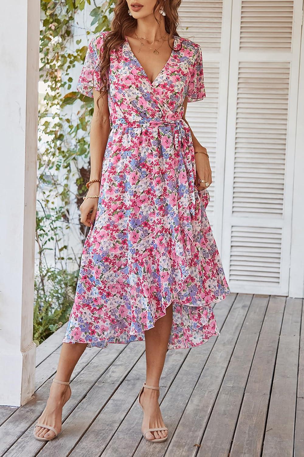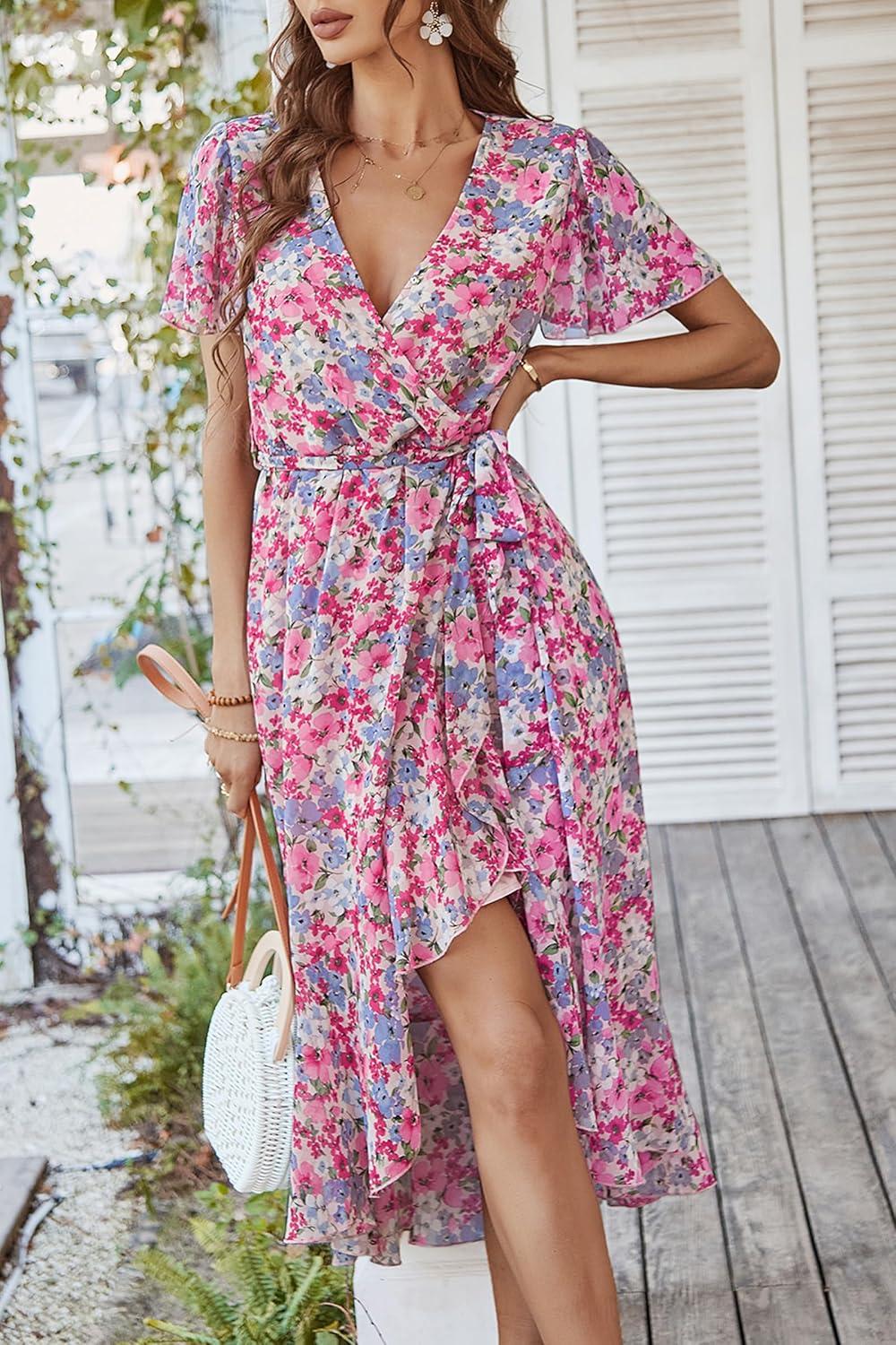 PRETTYGARDEN Women's Summer Floral Boho Maxi Dress Wrap Short Sleeve V Neck Ruffle A-Line Flowy Wedding Guest Long Dresses(Pink Floral)