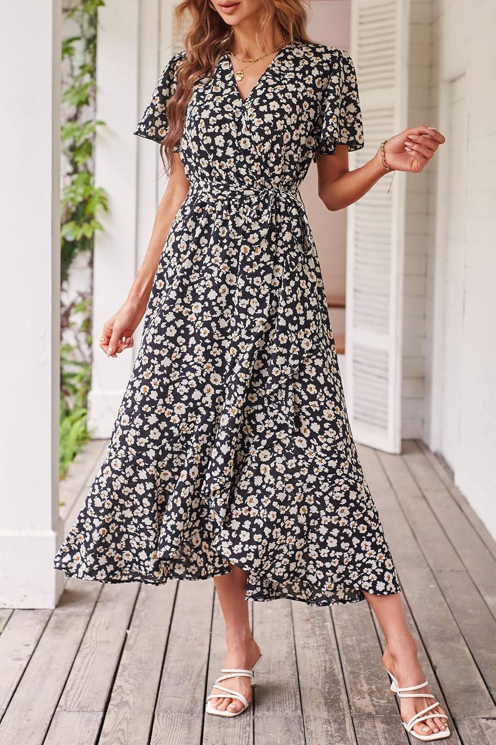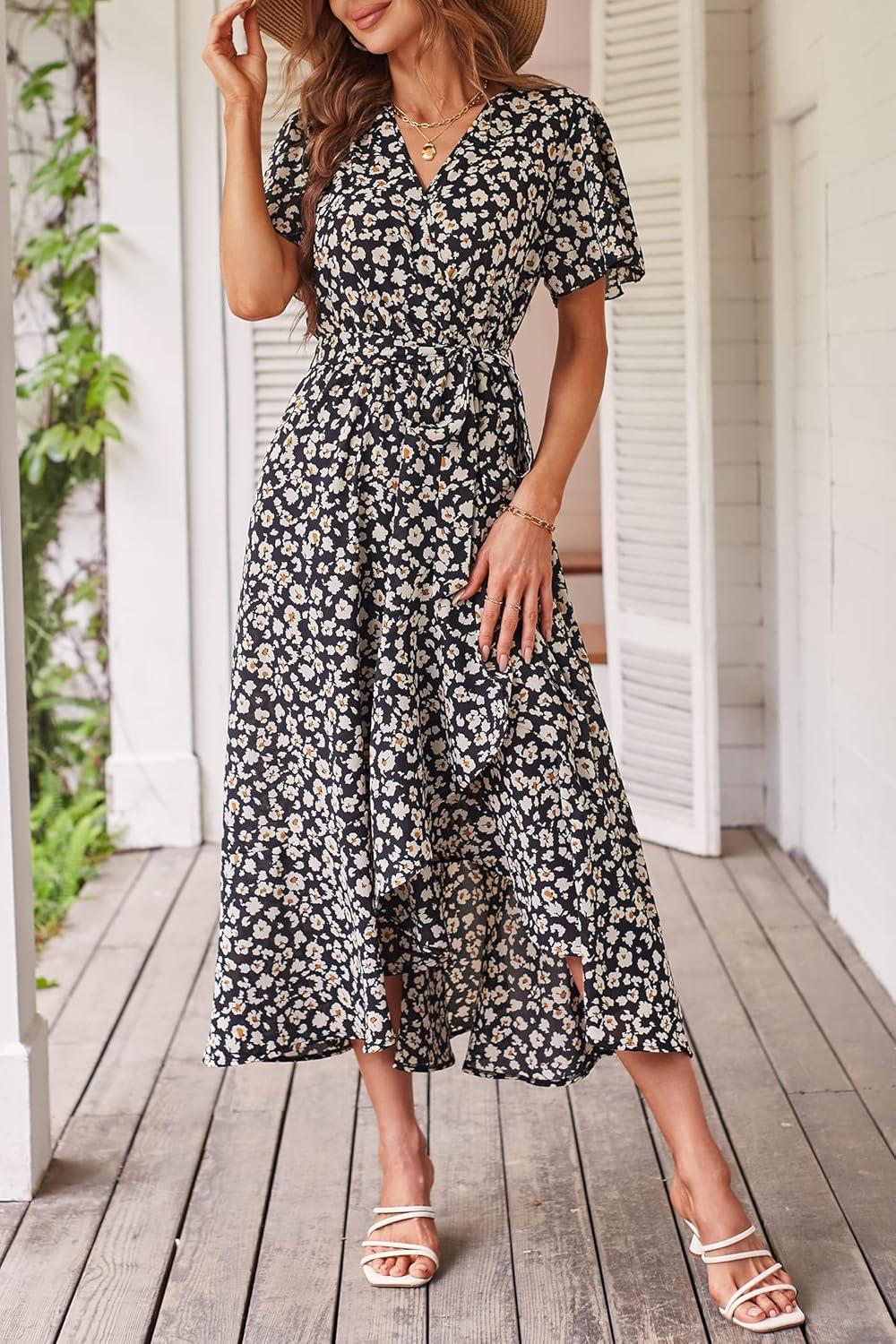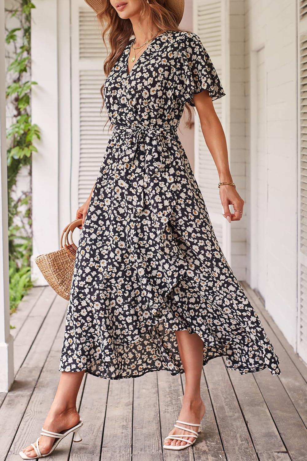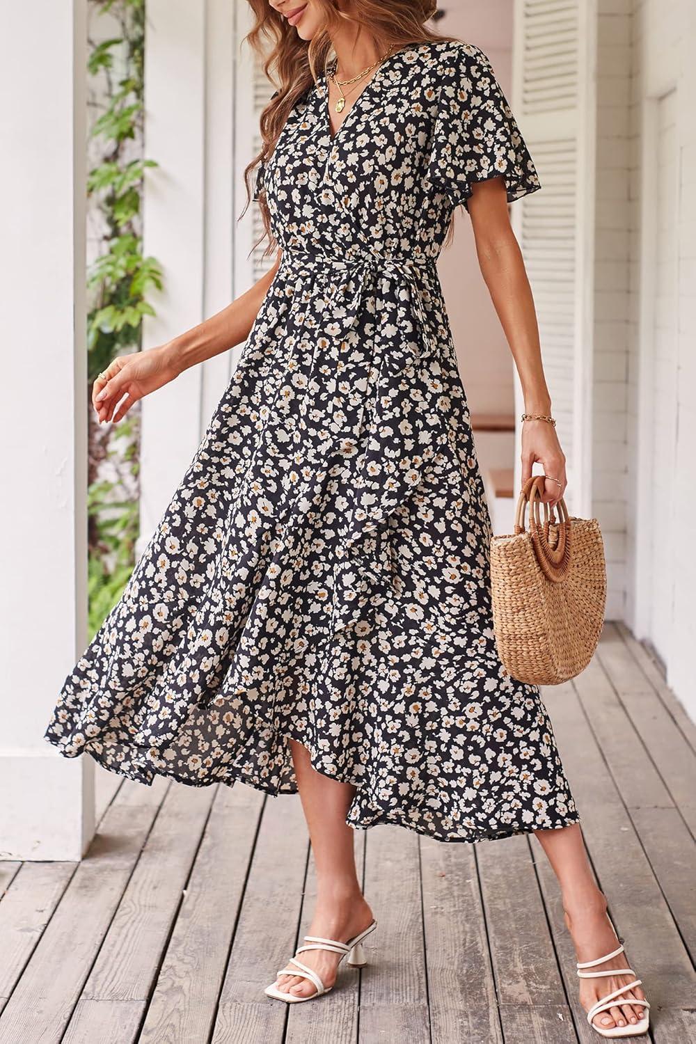 PRETTYGARDEN Women’s Summer Floral Boho Maxi Dress Wrap Short Sleeve V Neck Ruffle A-Line Flowy Wedding Guest Long Dresses(Print Black)