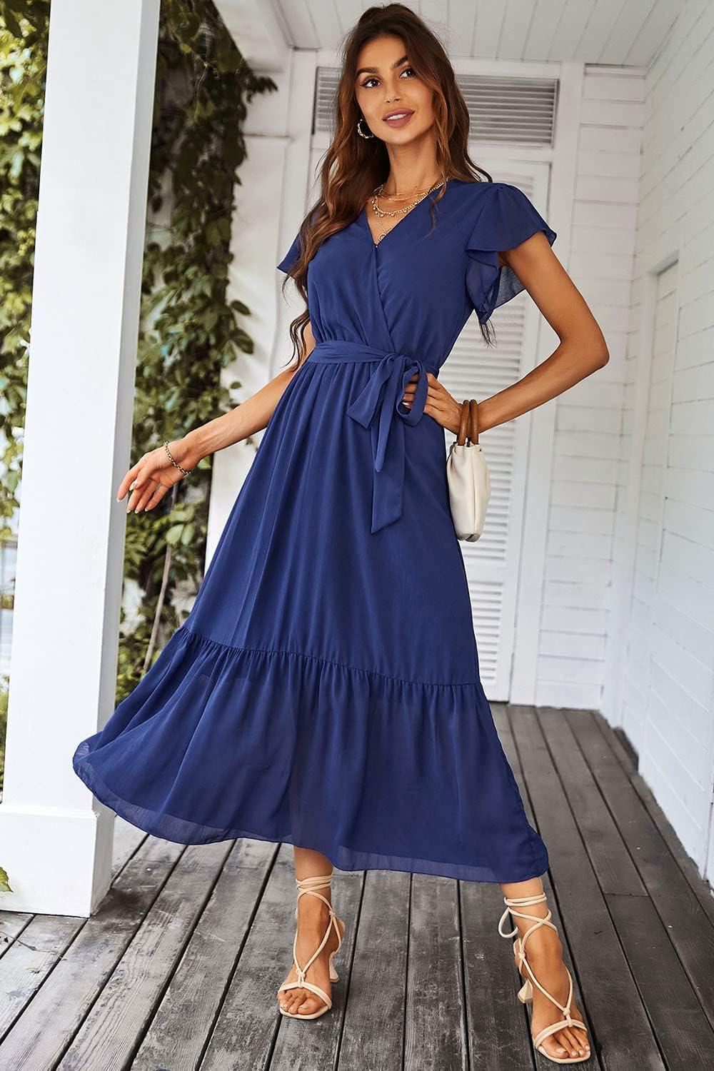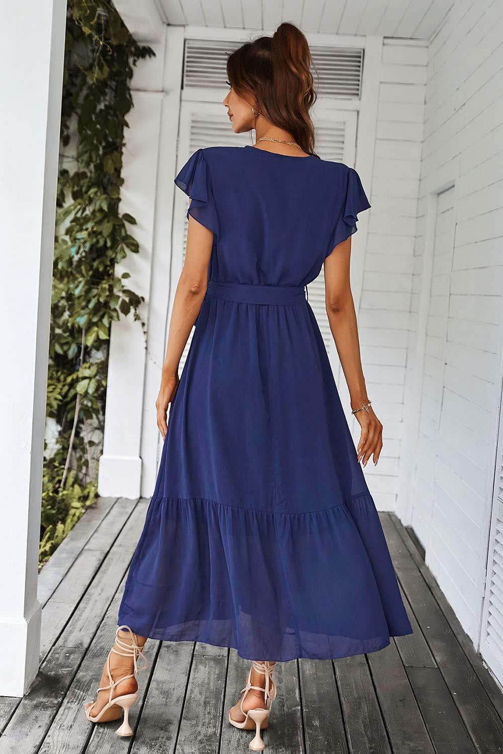 PRETTYGARDEN Women's Summer Floral Boho Maxi Dress Wrap Short Sleeve V Neck Ruffle A-Line Flowy Wedding Guest Long Dresses(Solid Blue)