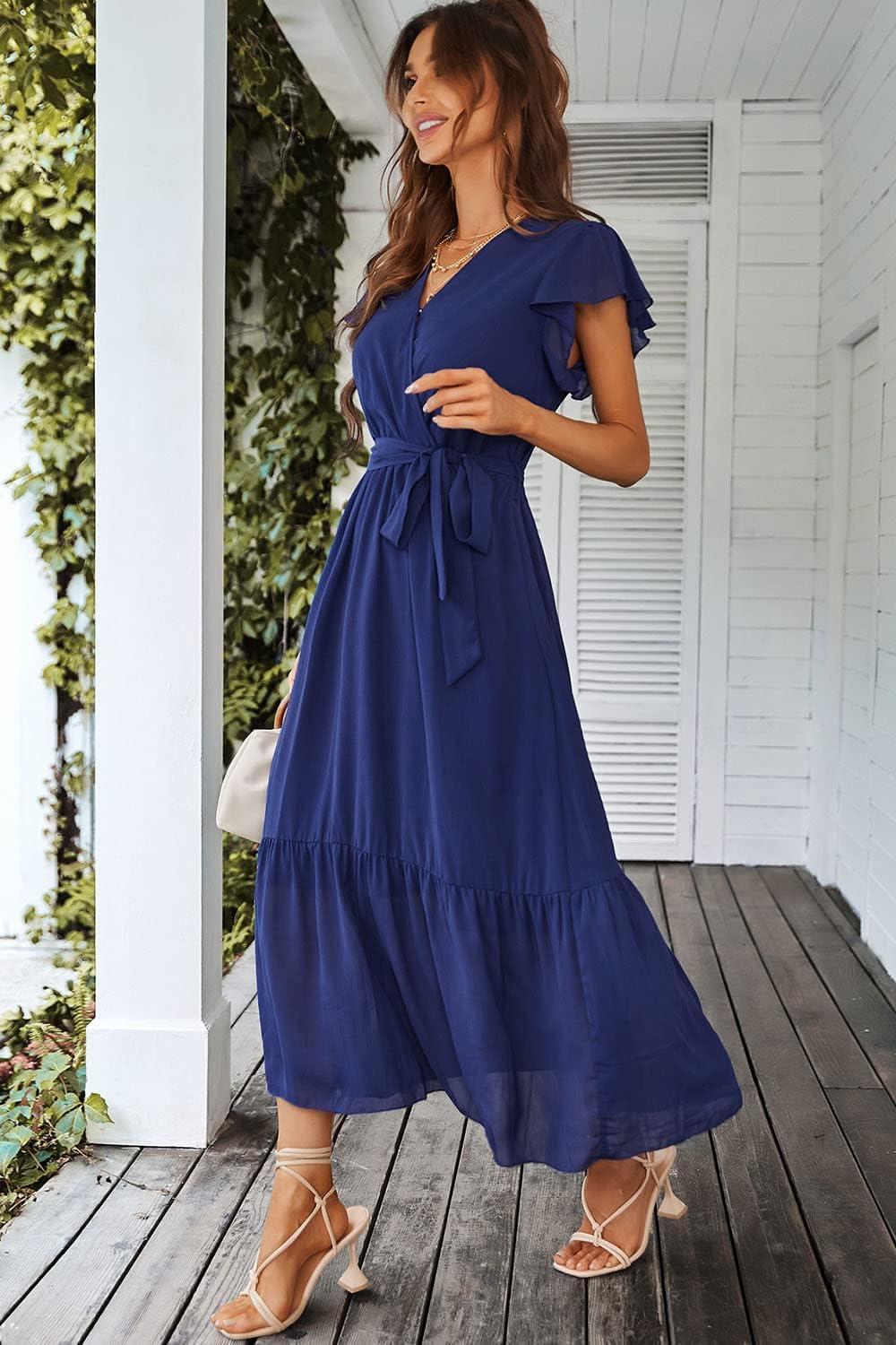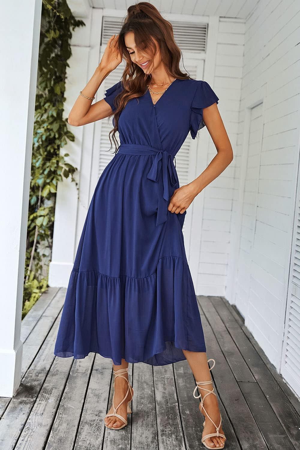 PRETTYGARDEN Women’s Summer Floral Boho Maxi Dress Wrap Short Sleeve V Neck Ruffle A-Line Flowy Wedding Guest Long Dresses(Solid Blue)