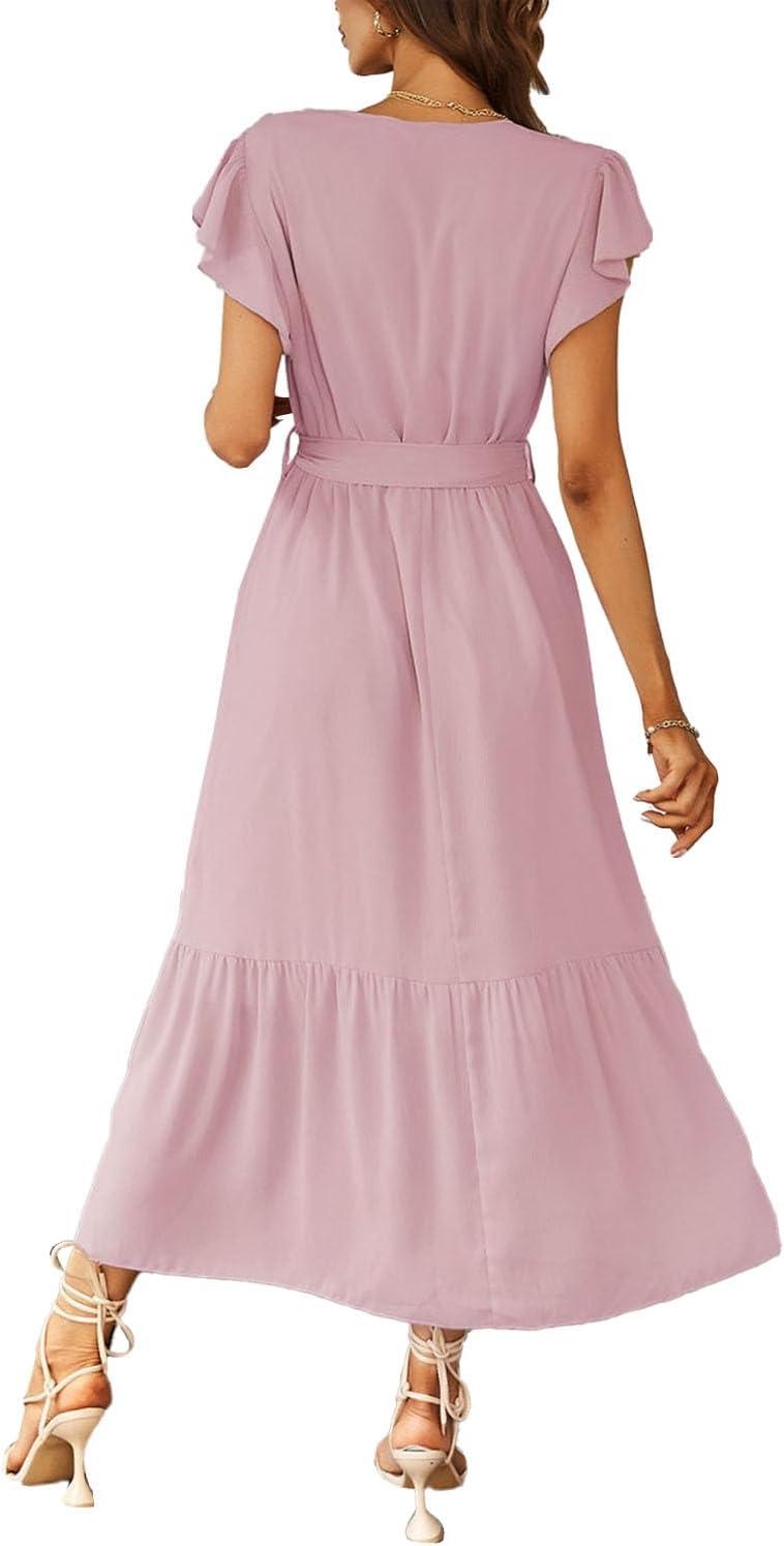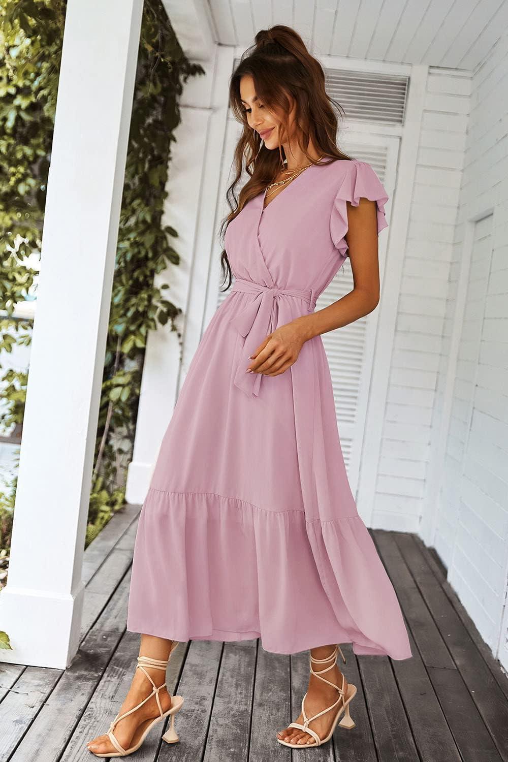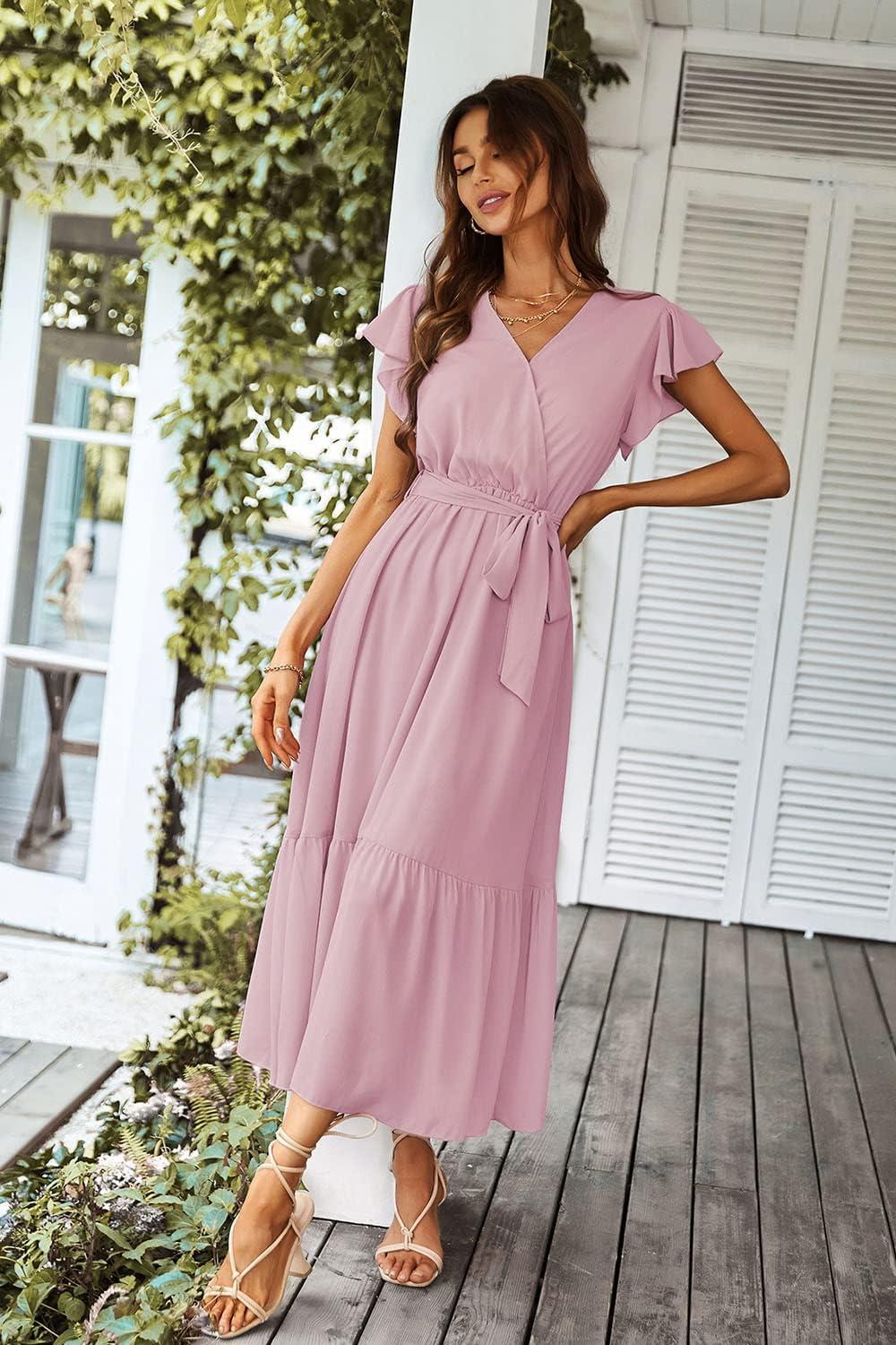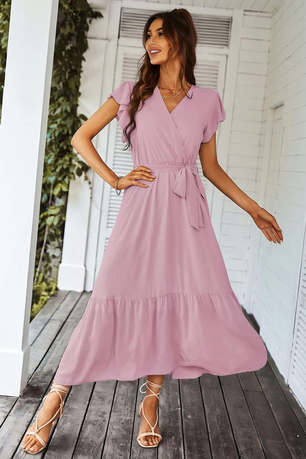 imagePRETTYGARDEN Womens Summer Floral Boho Maxi Dress Wrap Short Sleeve V Neck Ruffle ALine Flowy Wedding Guest Long DressesSolid Pink