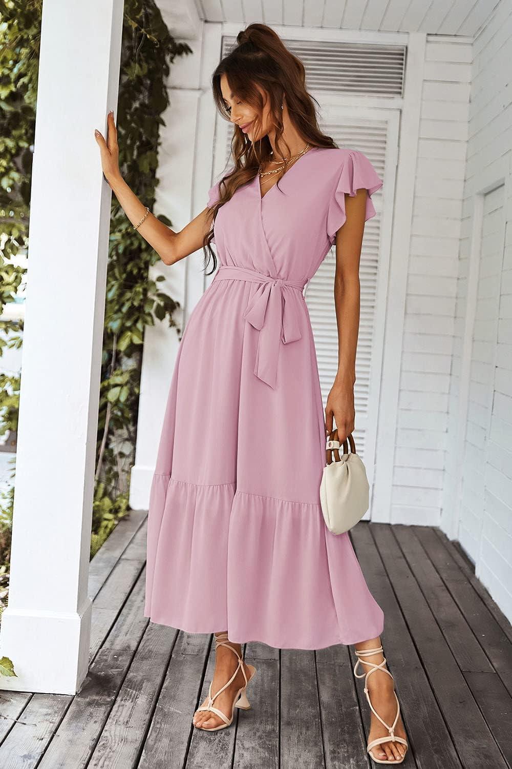 PRETTYGARDEN Women's Summer Floral Boho Maxi Dress Wrap Short Sleeve V Neck Ruffle A-Line Flowy Wedding Guest Long Dresses(Solid Pink)