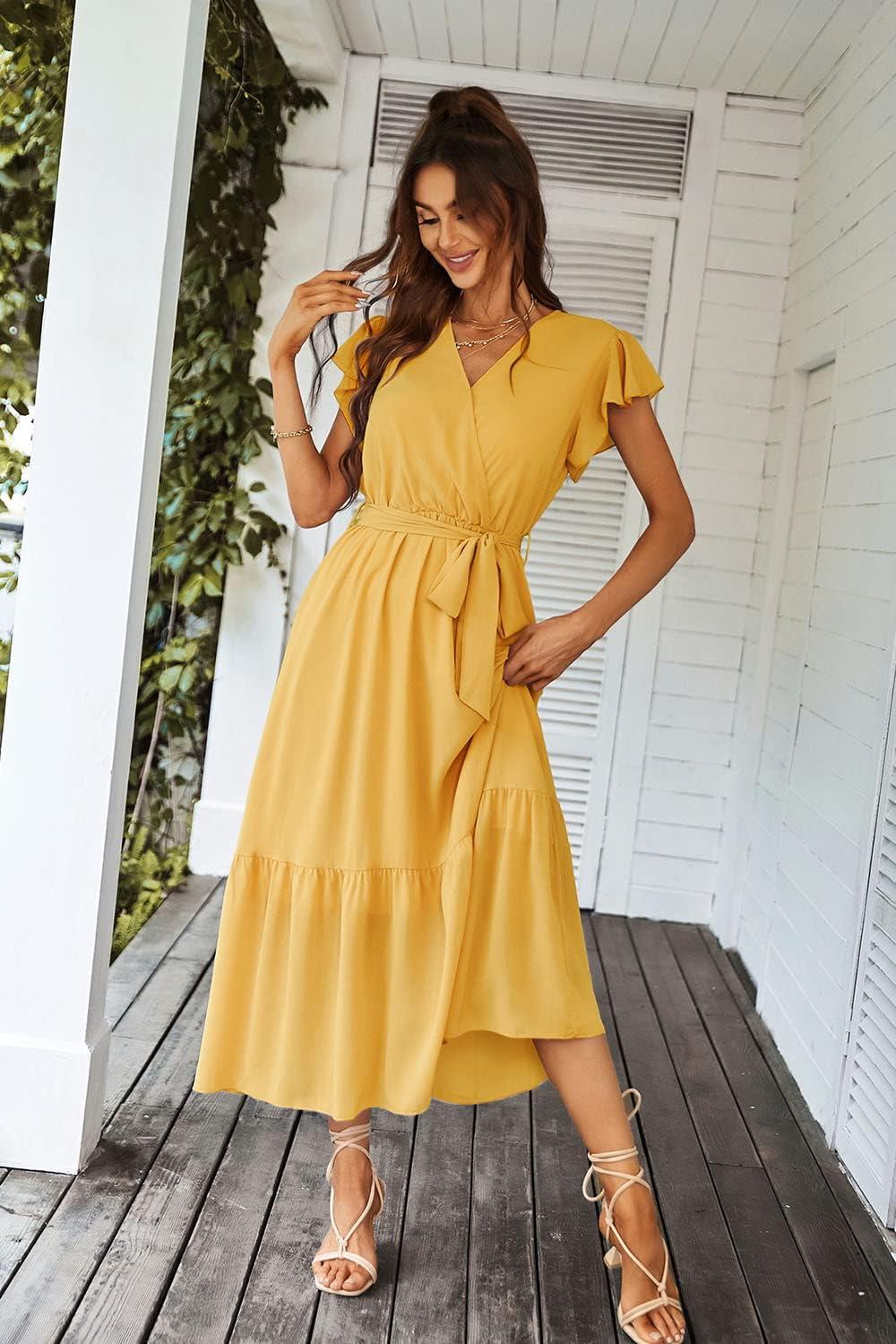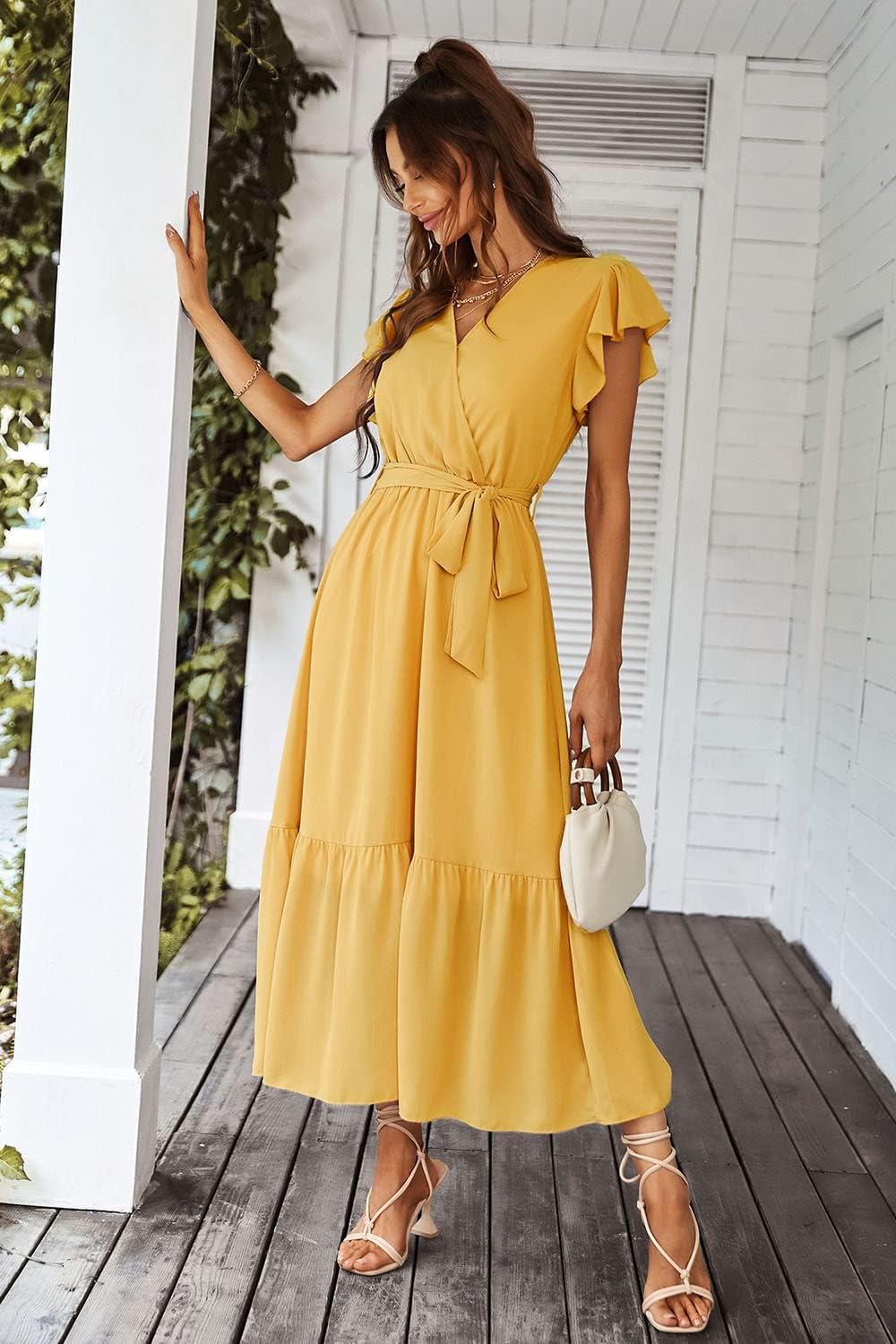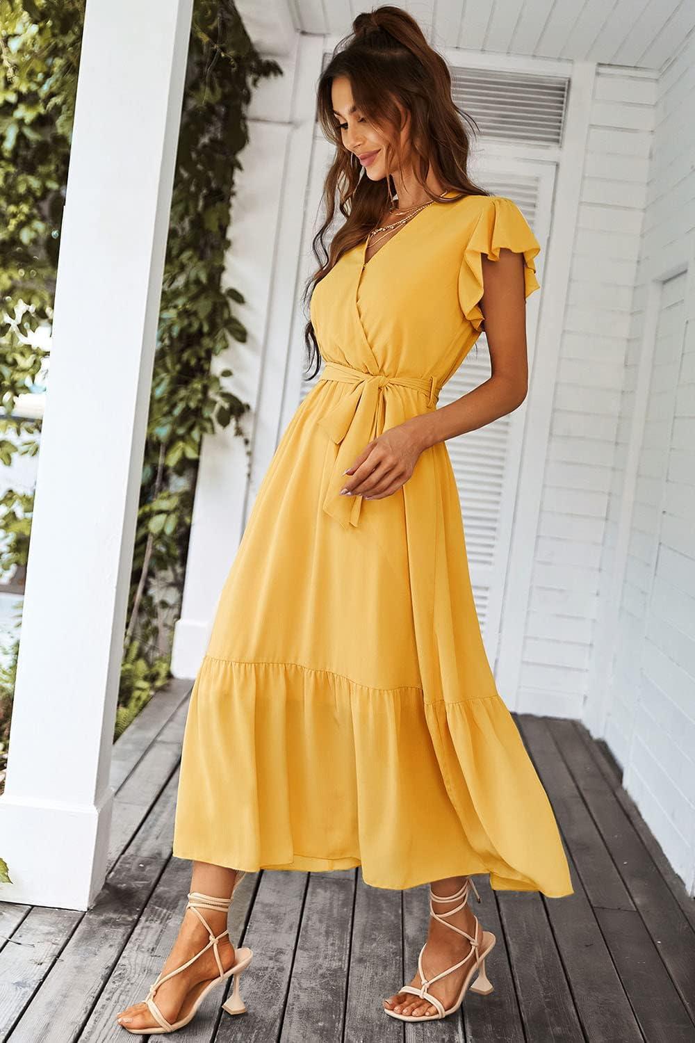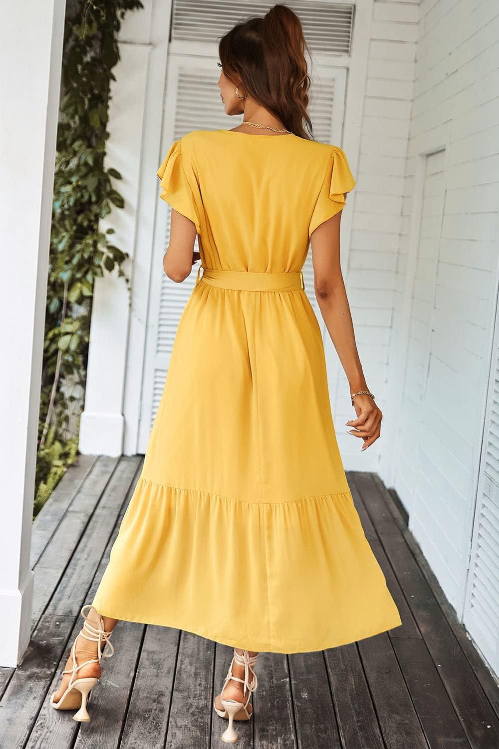 imagePRETTYGARDEN Womens Summer Floral Boho Maxi Dress Wrap Short Sleeve V Neck Ruffle ALine Flowy Wedding Guest Long DressesSolid Yellow