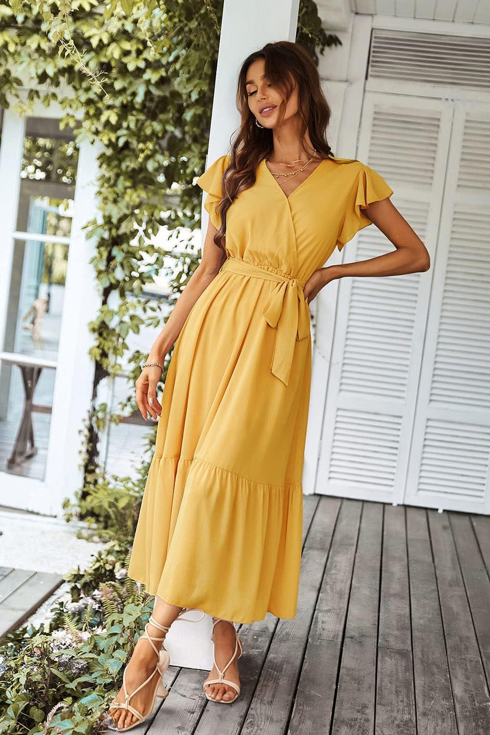 PRETTYGARDEN Women’s Summer Floral Boho Maxi Dress Wrap Short Sleeve V Neck Ruffle A-Line Flowy Wedding Guest Long Dresses(Solid Yellow)