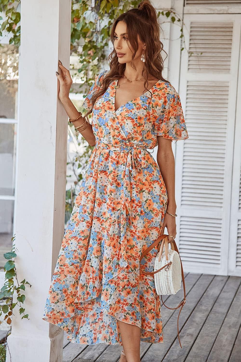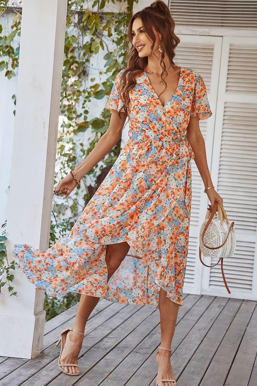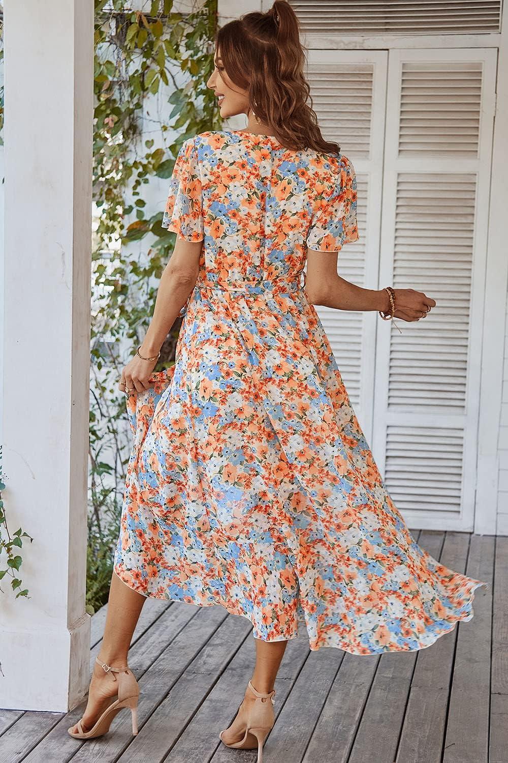PRETTYGARDEN Women's Summer Floral Boho Maxi Dress Wrap Short Sleeve V Neck Ruffle A-Line Flowy Wedding Guest Long Dresses(Yellow Floral)