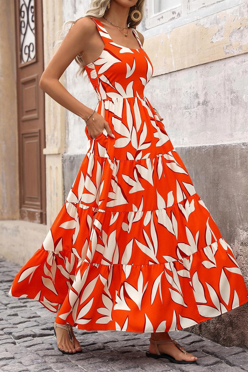 PRETTYGARDEN Women’s Summer Floral Maxi Dress Sleeveless Smocked Ruffle Long Flowy Beach Vacation Boho Sundresses(Floral Orange Pink)
