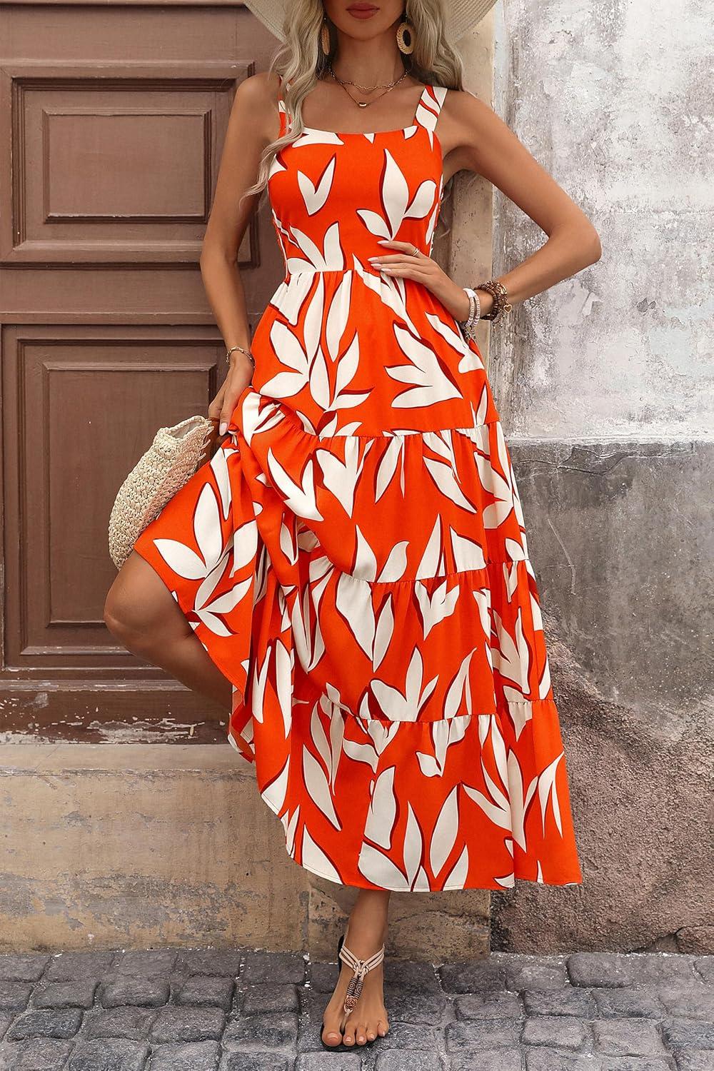 PRETTYGARDEN Women’s Summer Floral Maxi Dress Sleeveless Smocked Ruffle Long Flowy Beach Vacation Boho Sundresses(Floral Orange Beige)