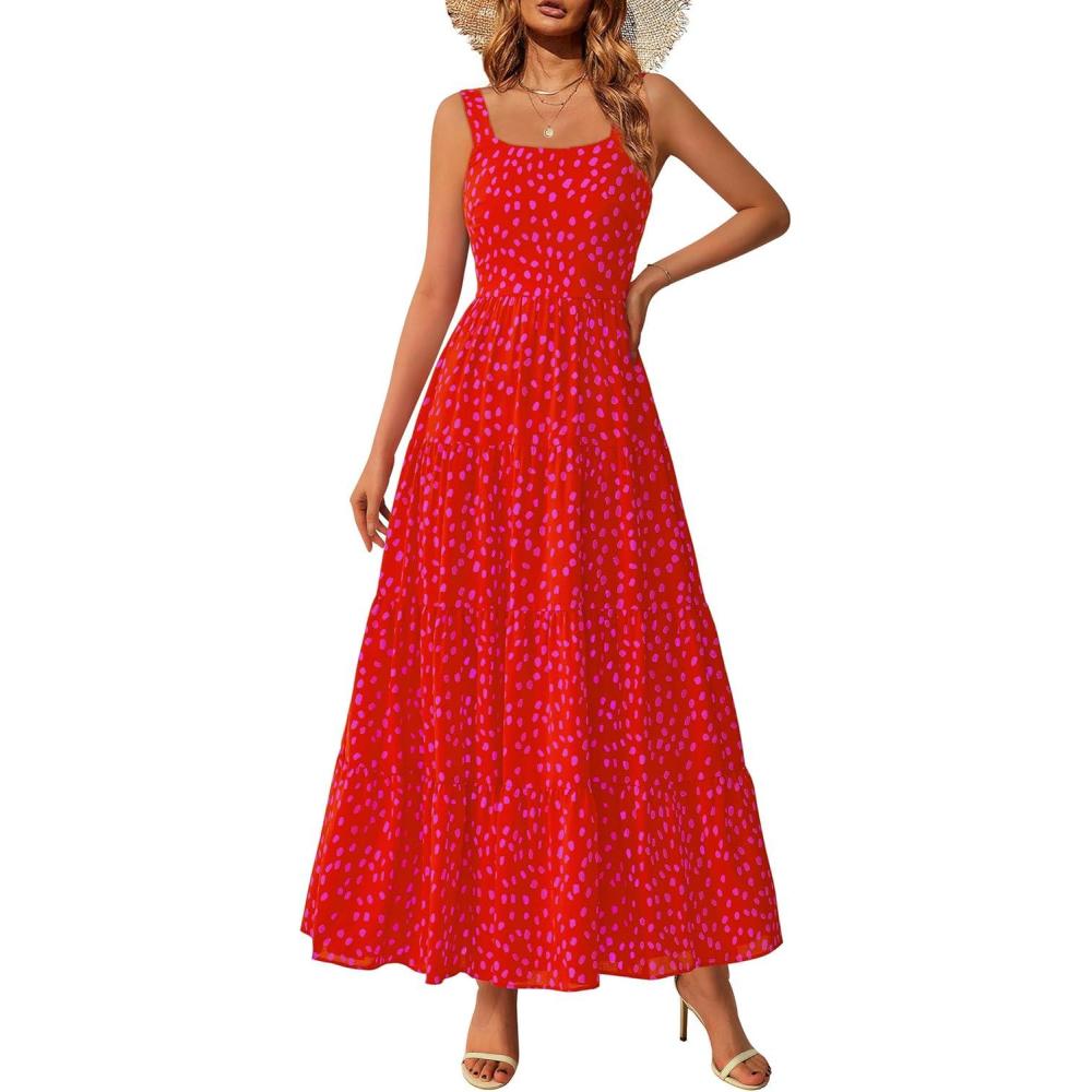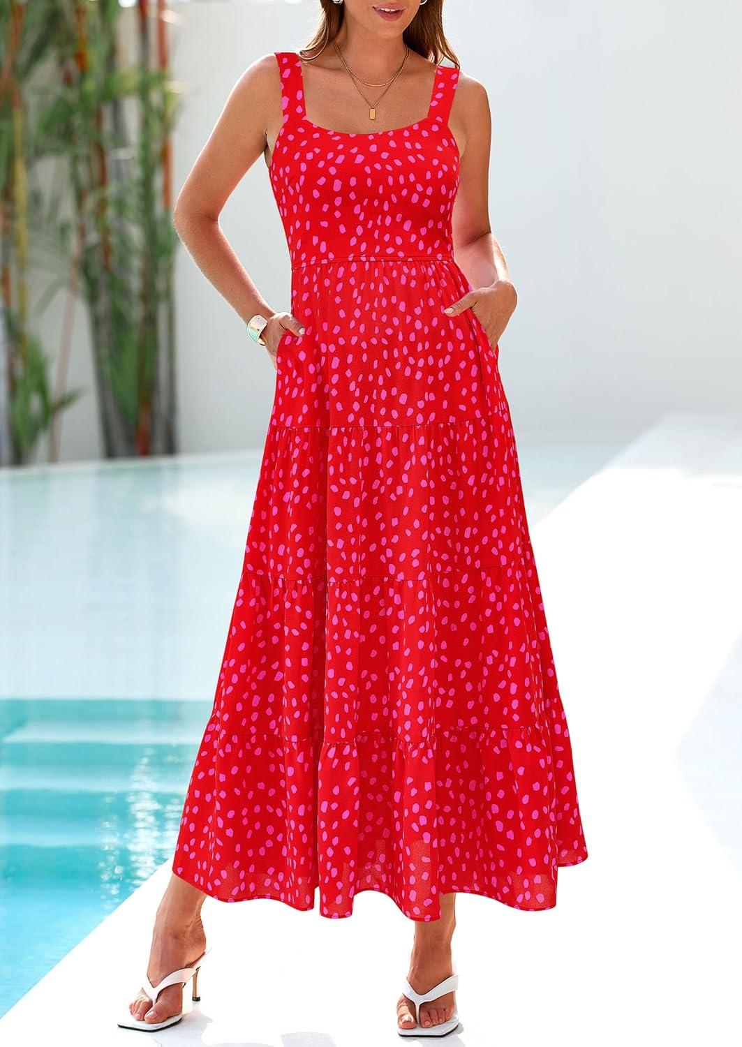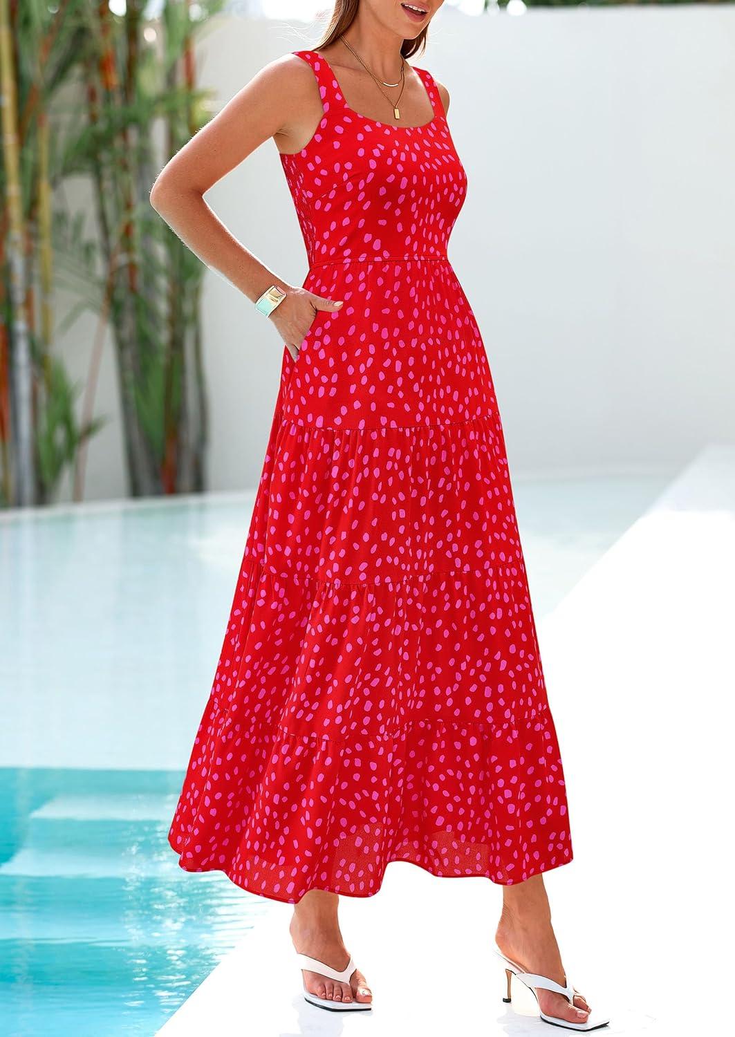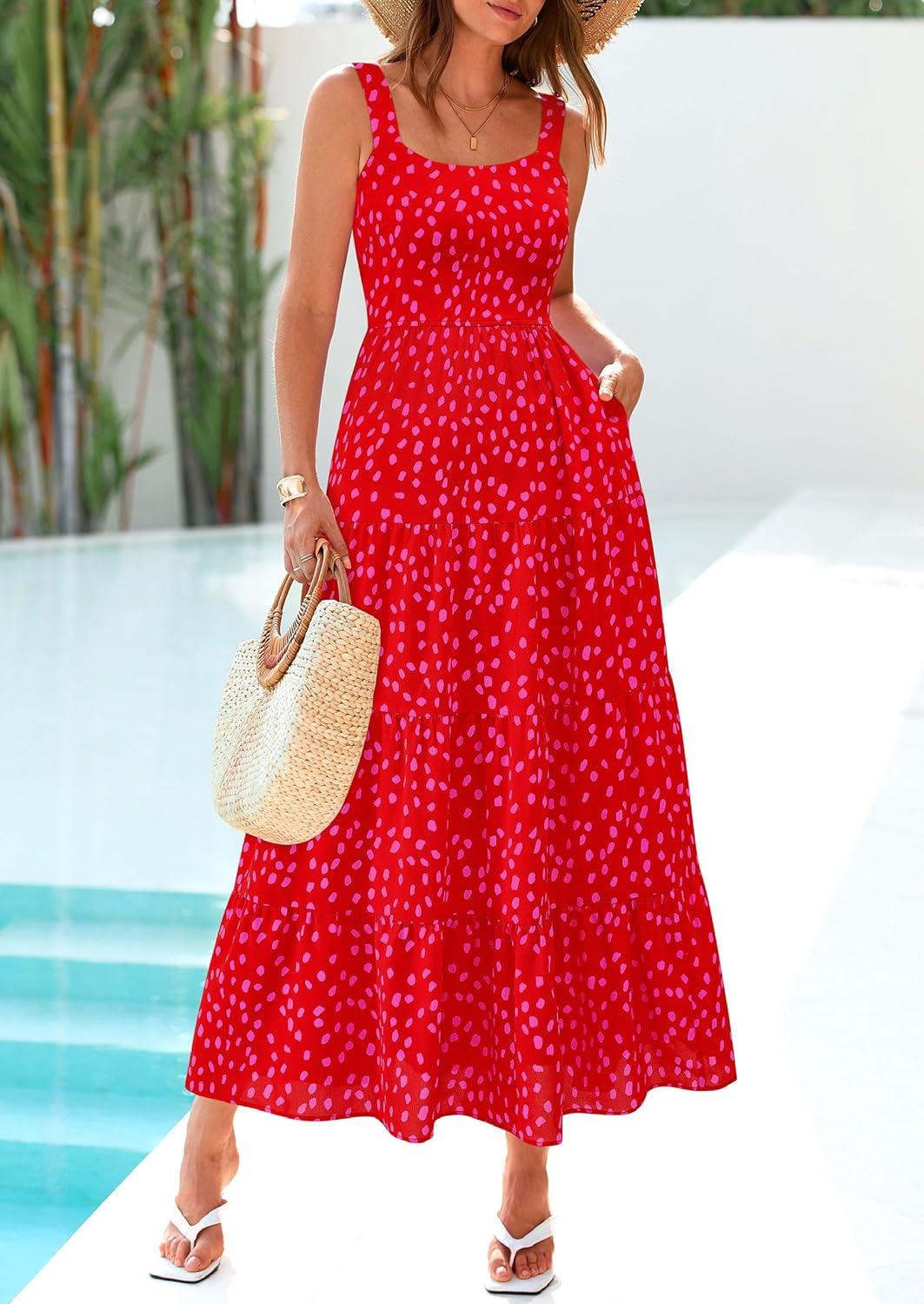 PRETTYGARDEN Women’s Summer Floral Maxi Dress Sleeveless Smocked Ruffle Long Flowy Beach Vacation Boho Sundresses(Red Floral)