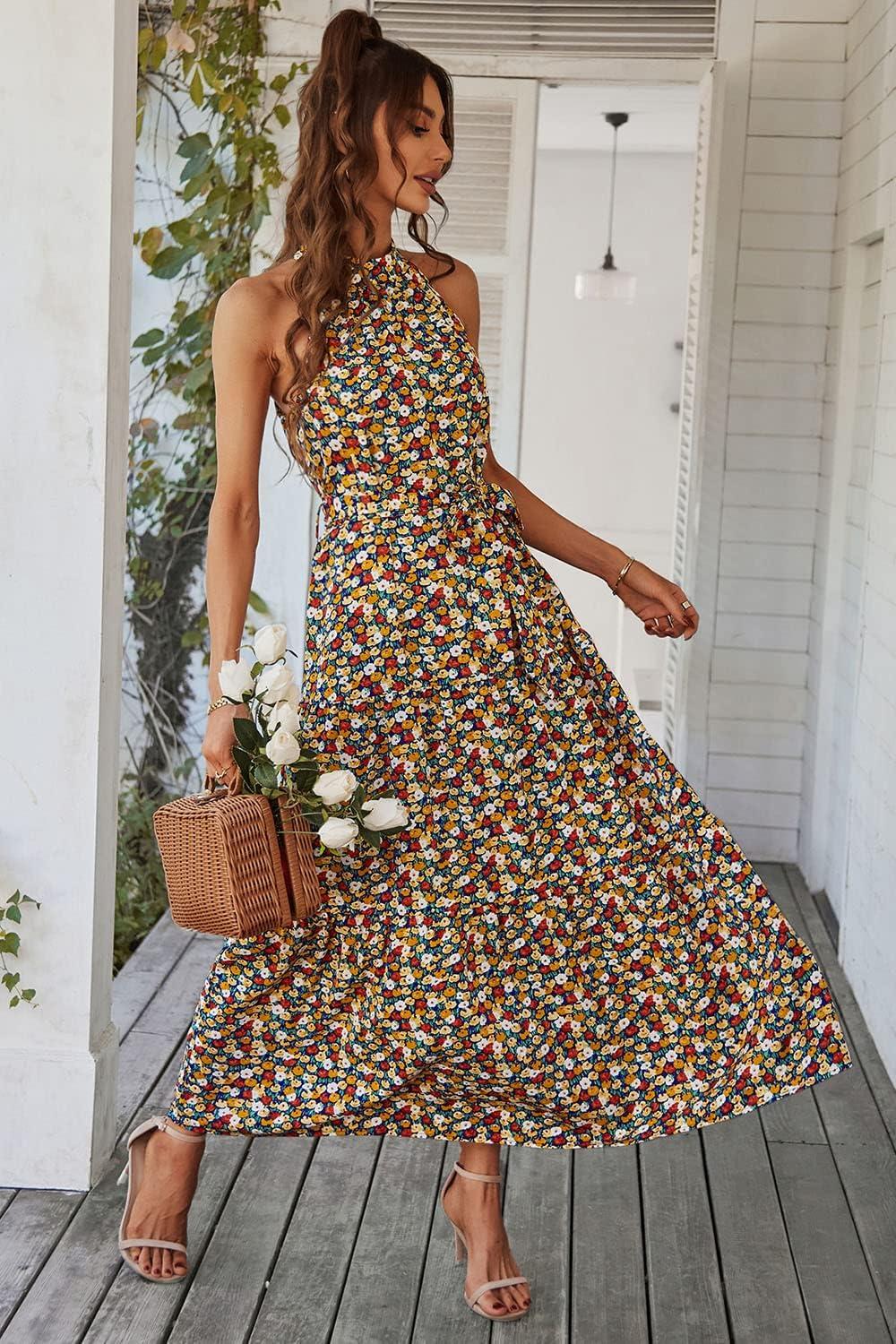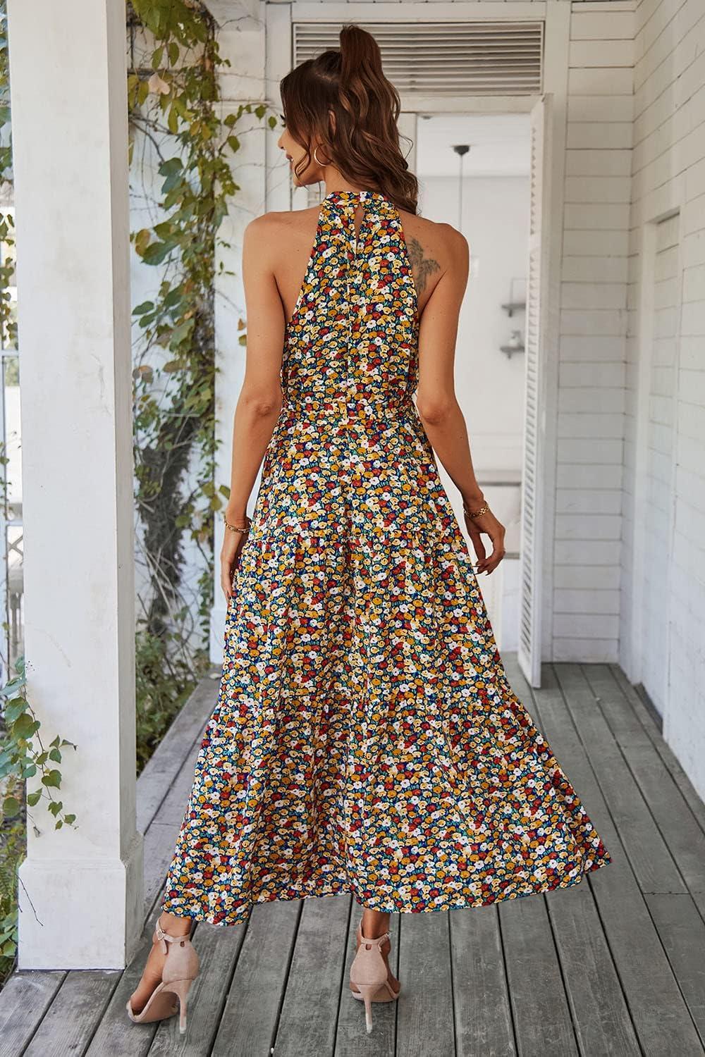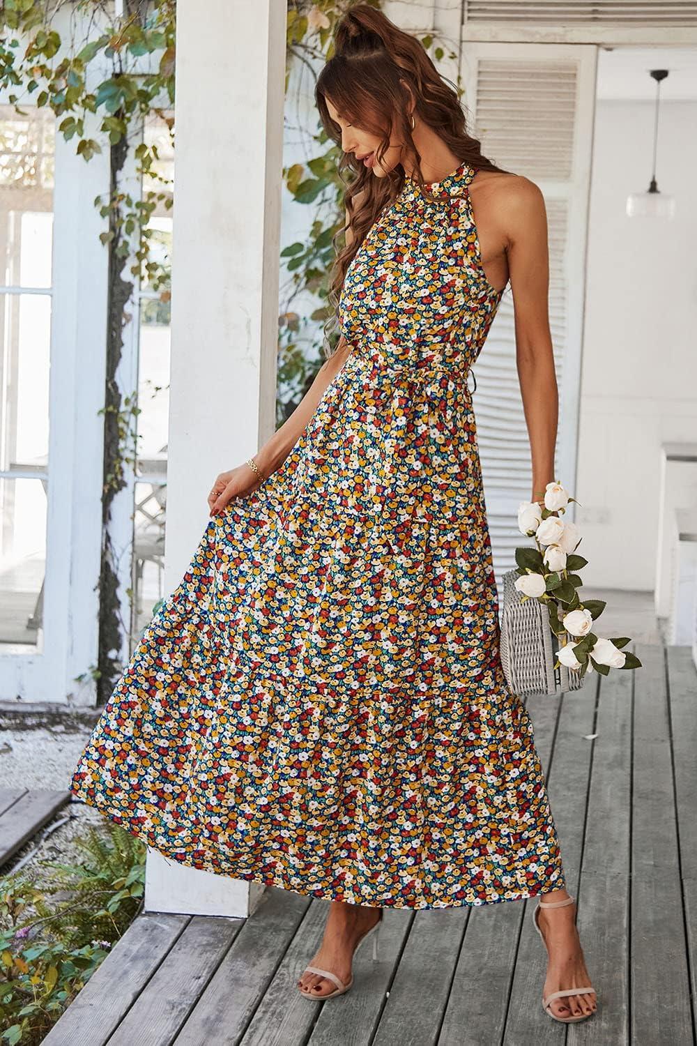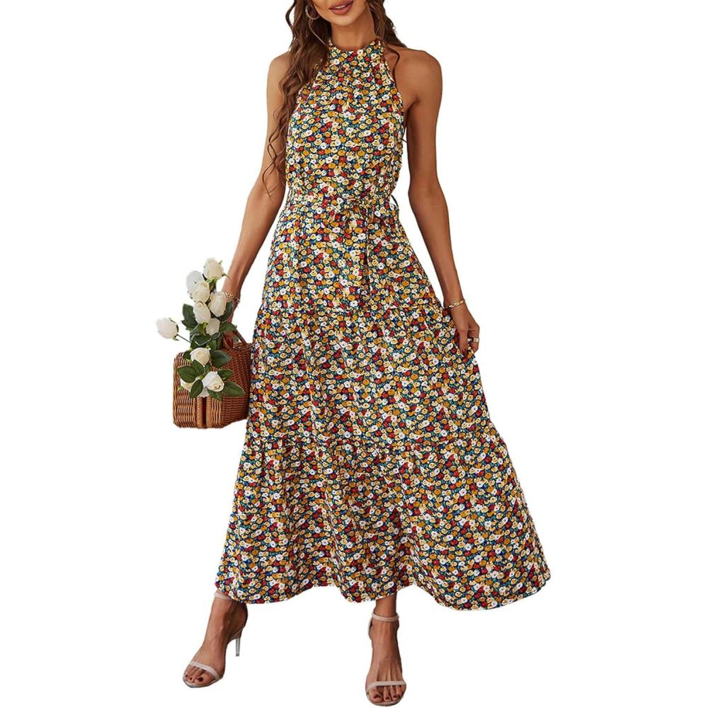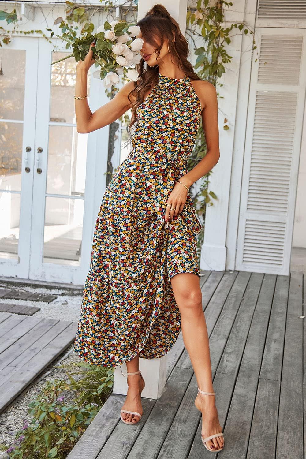 imagePRETTYGARDEN Womens Summer Floral Maxi Sun Dress Sleeveless Halter Neck Flowy Ruffle Hem Long Boho Dresses with BeltFloral Black