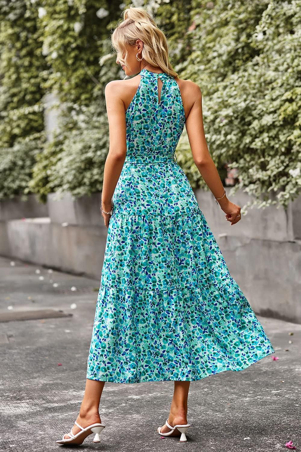 PRETTYGARDEN Women's Summer Floral Maxi Sun Dress Sleeveless Halter Neck Flowy Ruffle Hem Long Boho Dresses with Belt(Floral Sky Blue)
