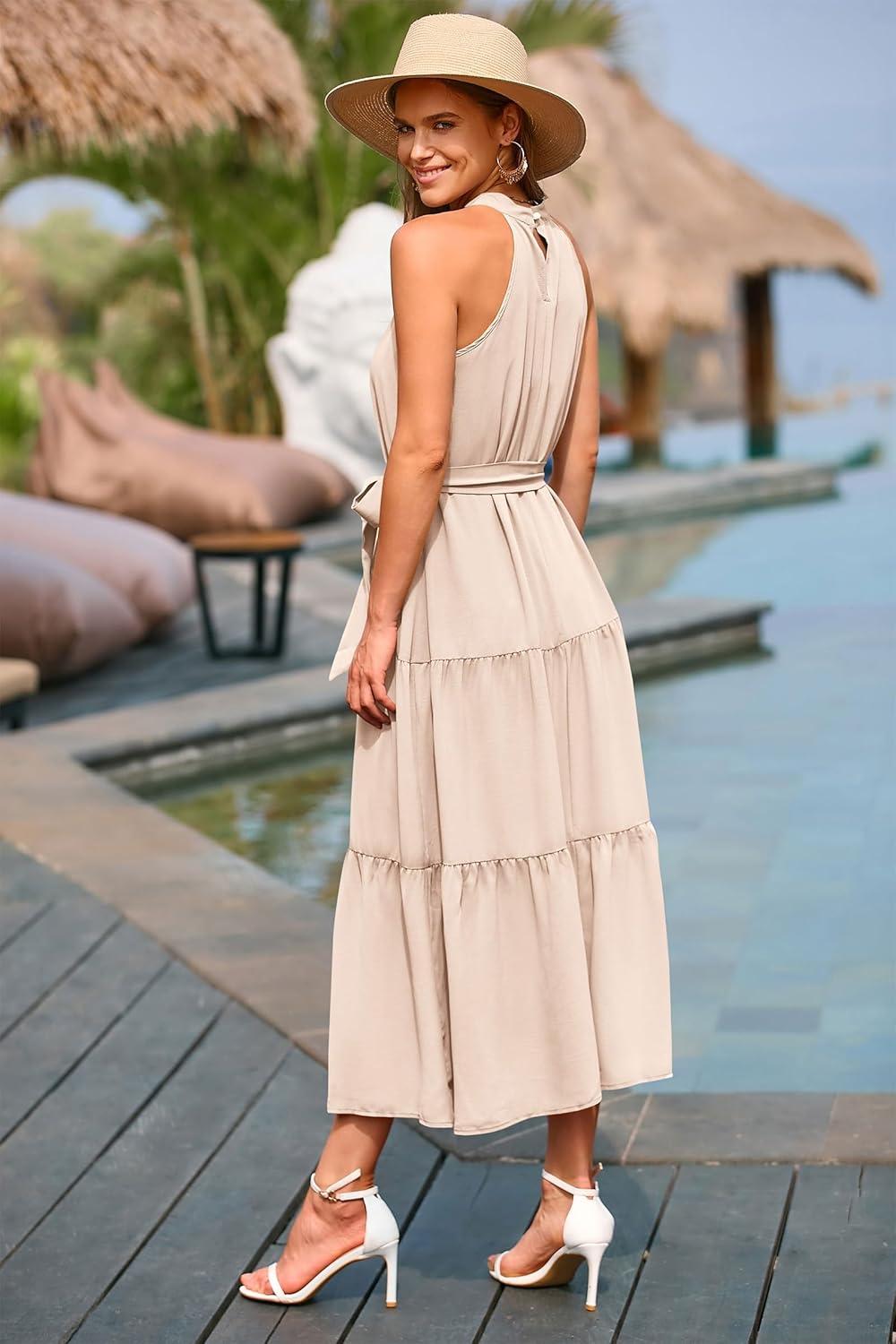 PRETTYGARDEN Women’s Summer Floral Maxi Sun Dress Sleeveless Halter Neck Flowy Ruffle Hem Long Boho Dresses with Belt(Solid Beige)