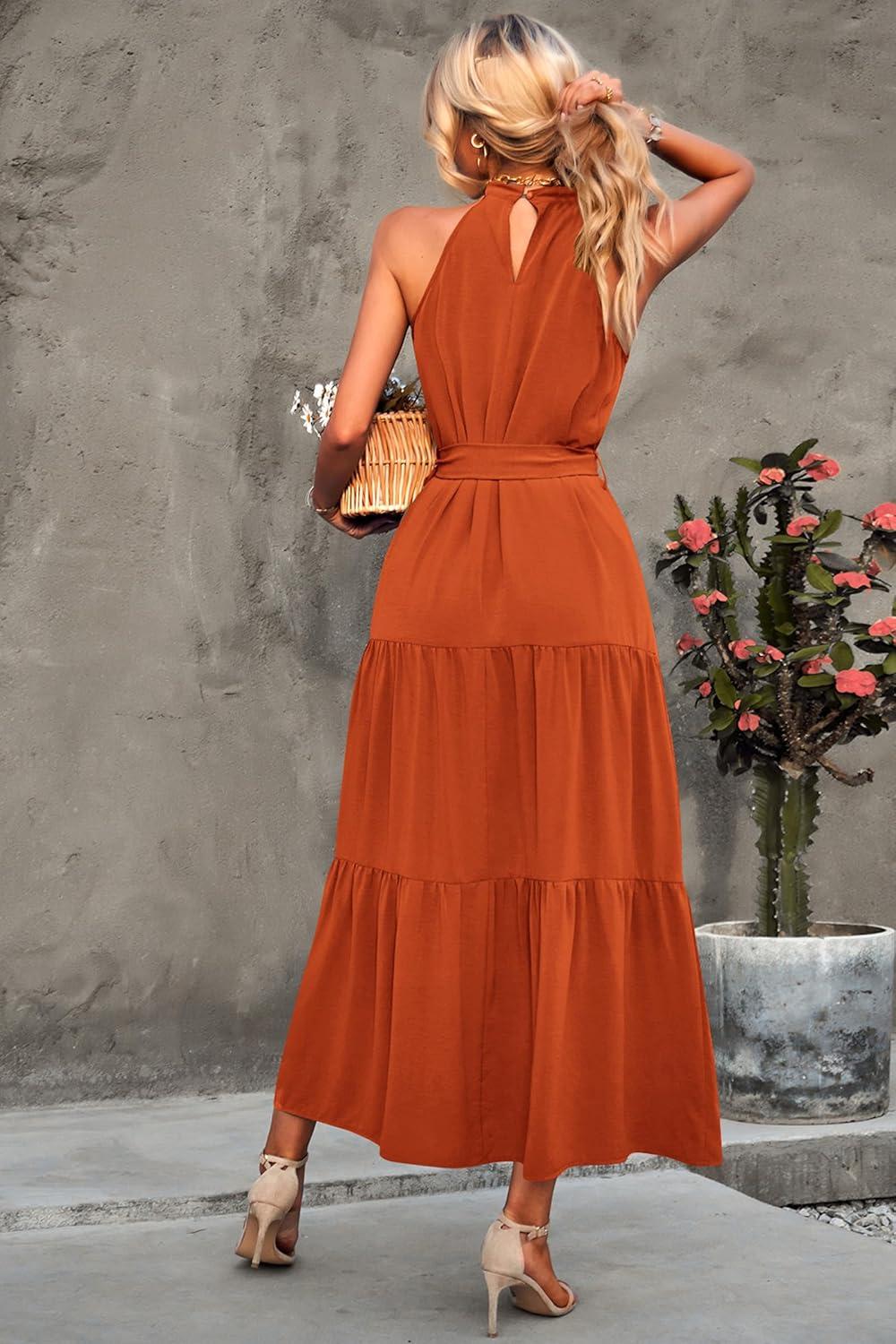 PRETTYGARDEN Women's Summer Floral Maxi Sun Dress Sleeveless Halter Neck Flowy Ruffle Hem Long Boho Dresses with Belt(Solid Brown)