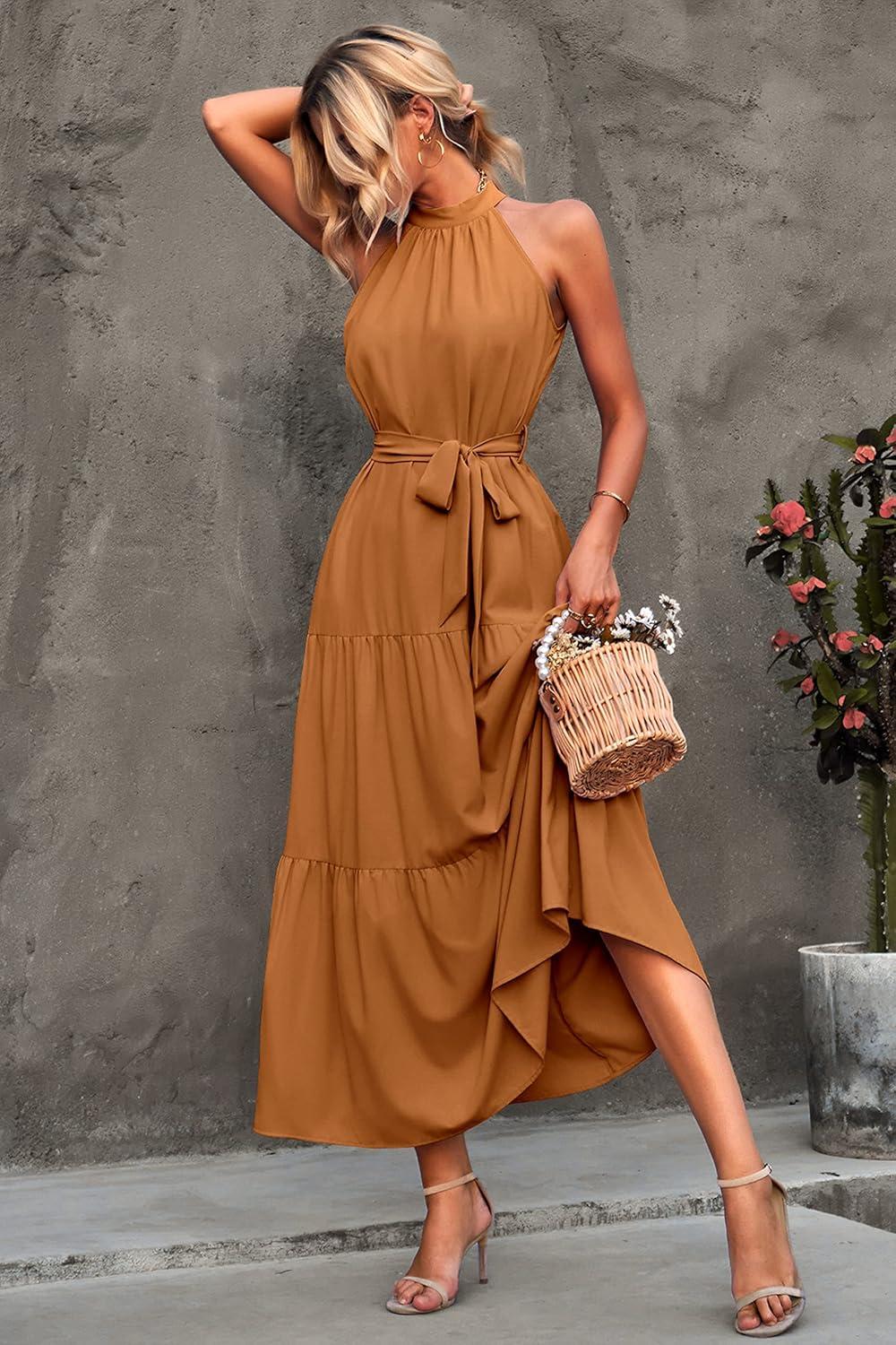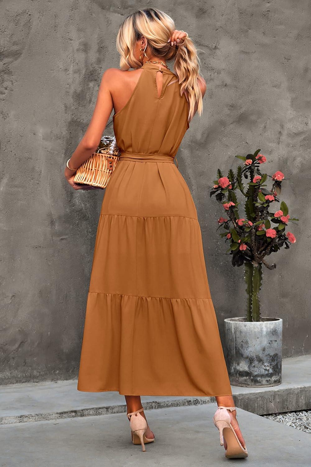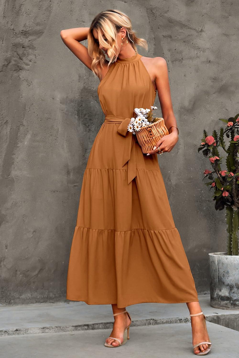 PRETTYGARDEN Women's Summer Floral Maxi Sun Dress Sleeveless Halter Neck Flowy Ruffle Hem Long Boho Dresses with Belt(Solid Light Brown)