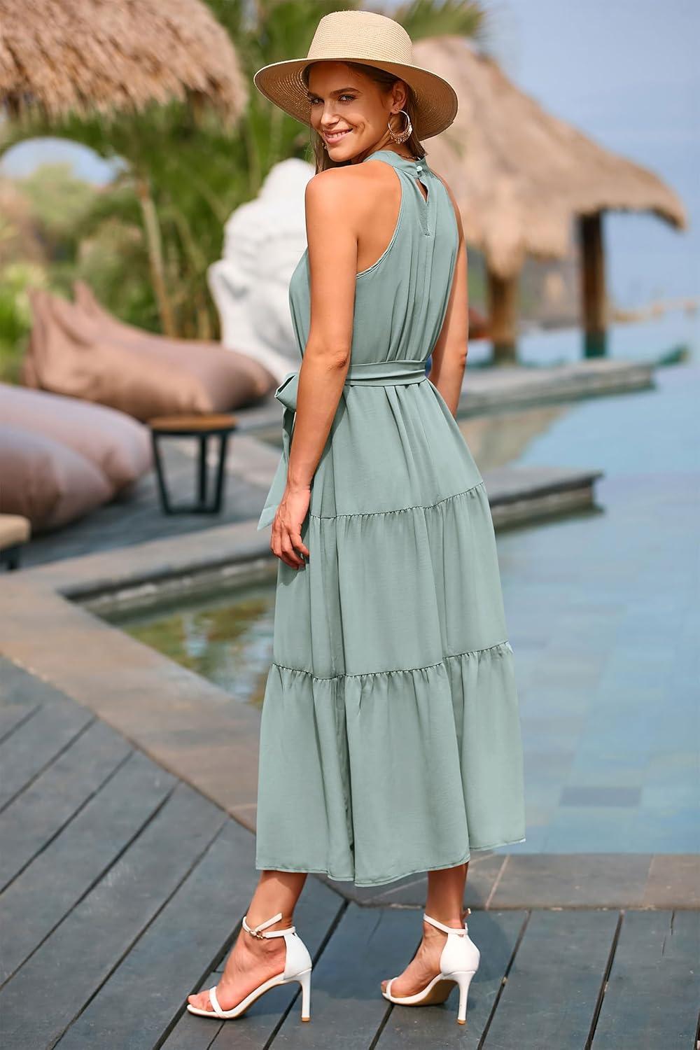 imagePRETTYGARDEN Womens Summer Floral Maxi Sun Dress Sleeveless Halter Neck Flowy Ruffle Hem Long Boho Dresses with BeltSolid Light Green