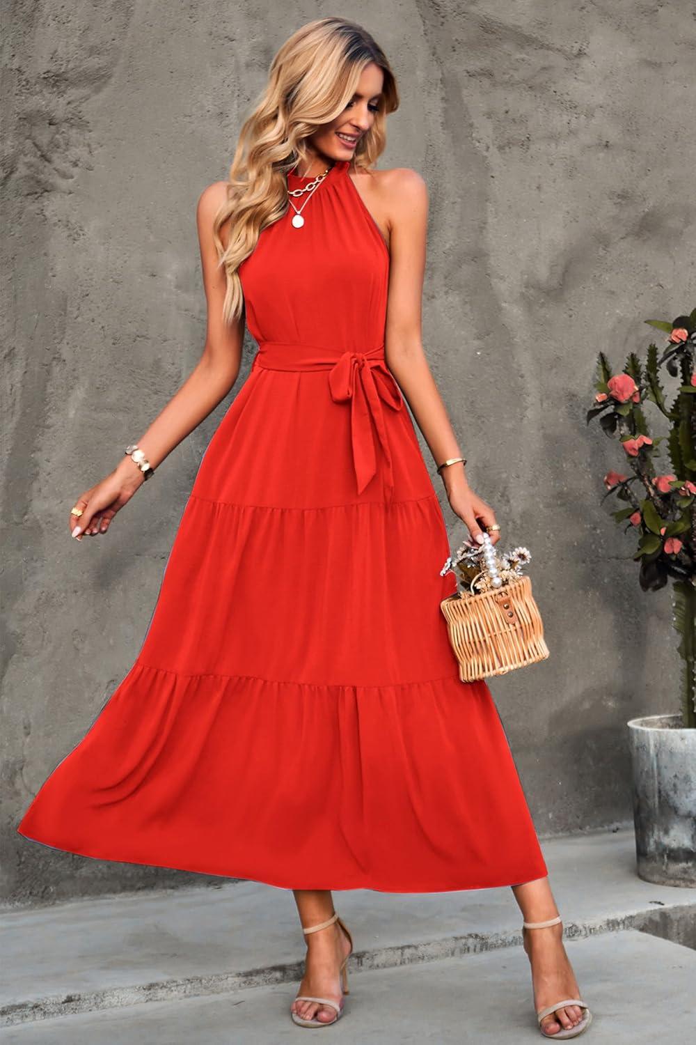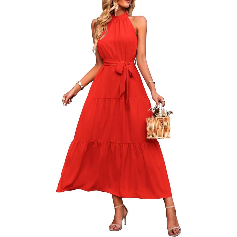 imagePRETTYGARDEN Womens Summer Floral Maxi Sun Dress Sleeveless Halter Neck Flowy Ruffle Hem Long Boho Dresses with BeltSolid Orange