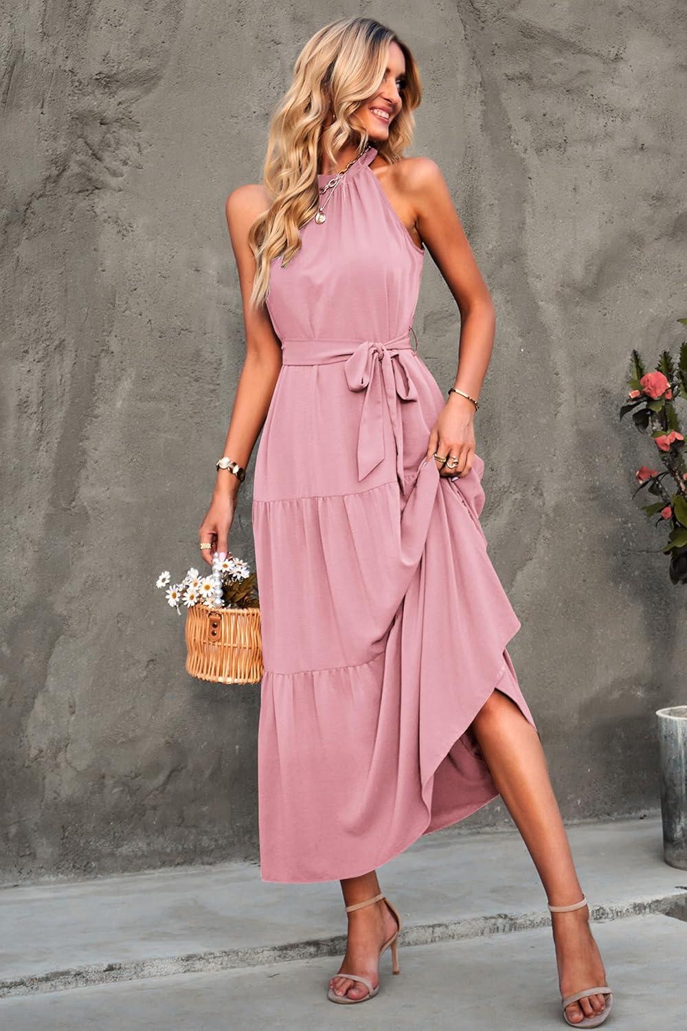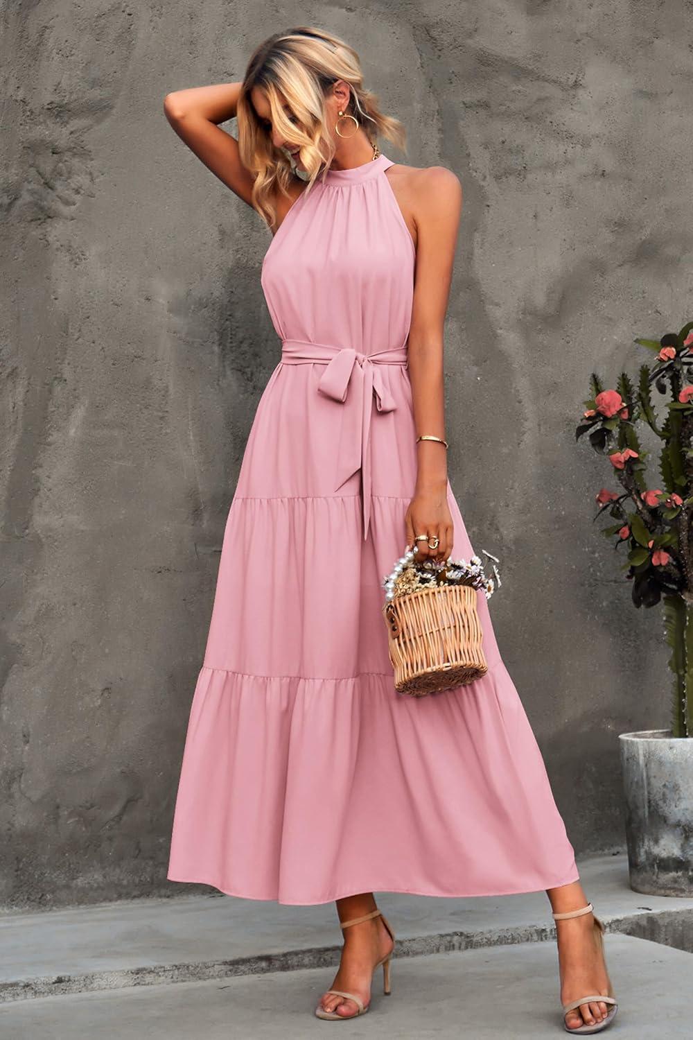 PRETTYGARDEN Women's Summer Floral Maxi Sun Dress Sleeveless Halter Neck Flowy Ruffle Hem Long Boho Dresses with Belt(Solid Pink)