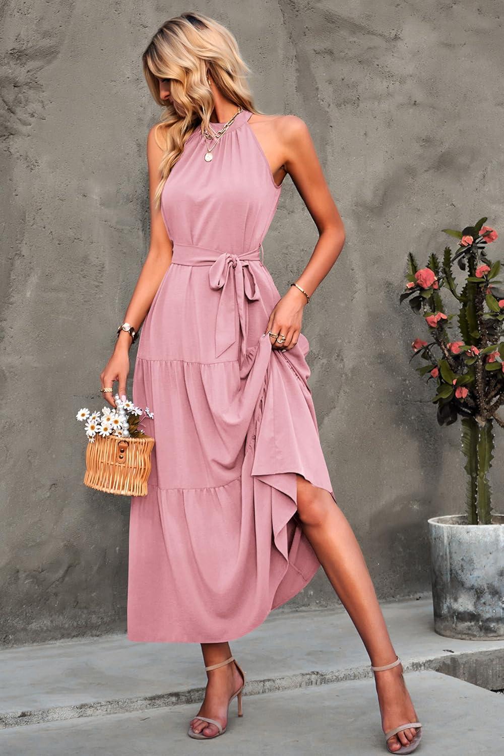 imagePRETTYGARDEN Womens Summer Floral Maxi Sun Dress Sleeveless Halter Neck Flowy Ruffle Hem Long Boho Dresses with BeltSolid Pink