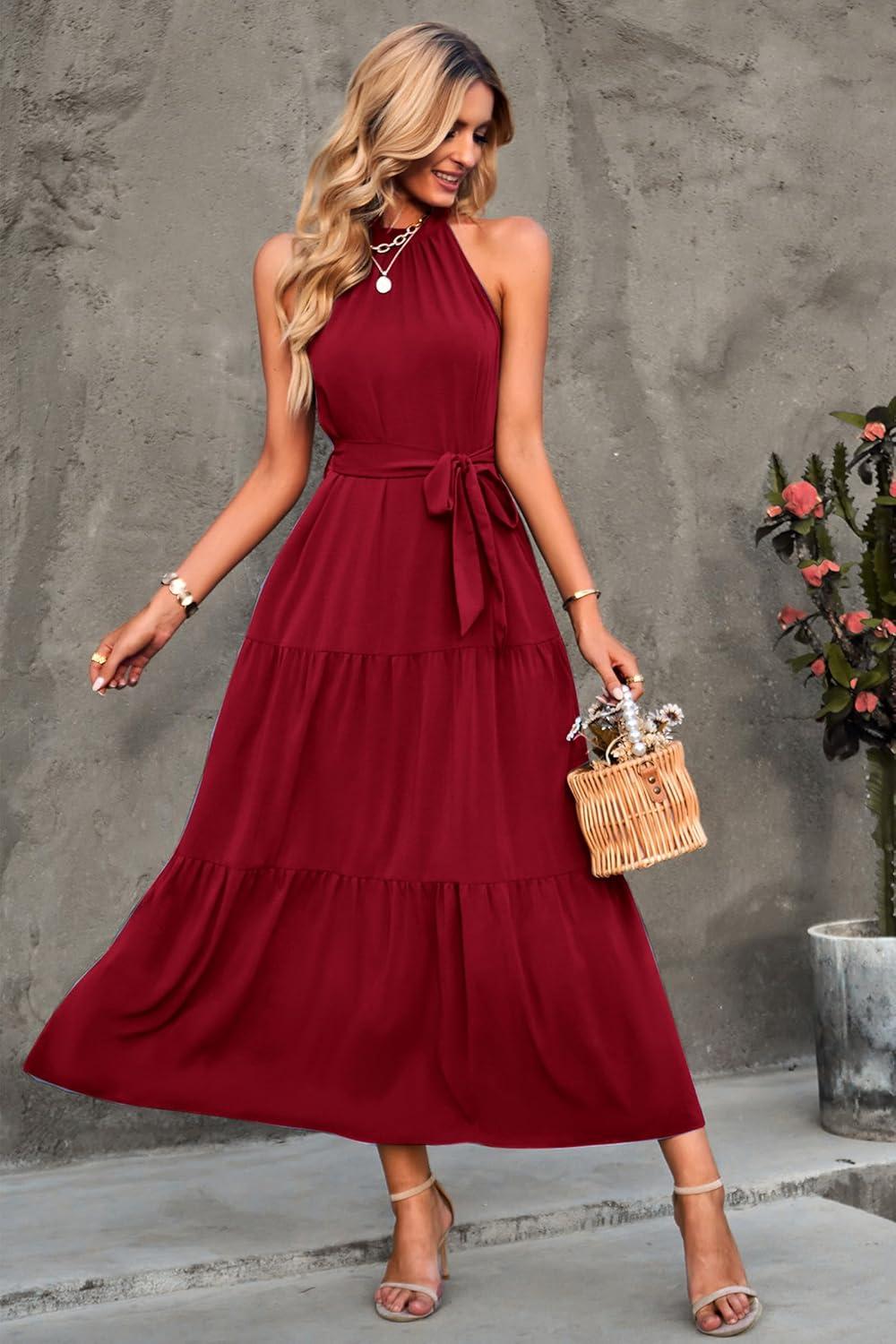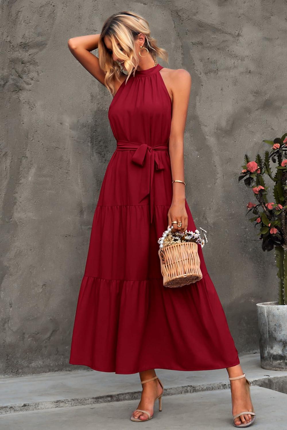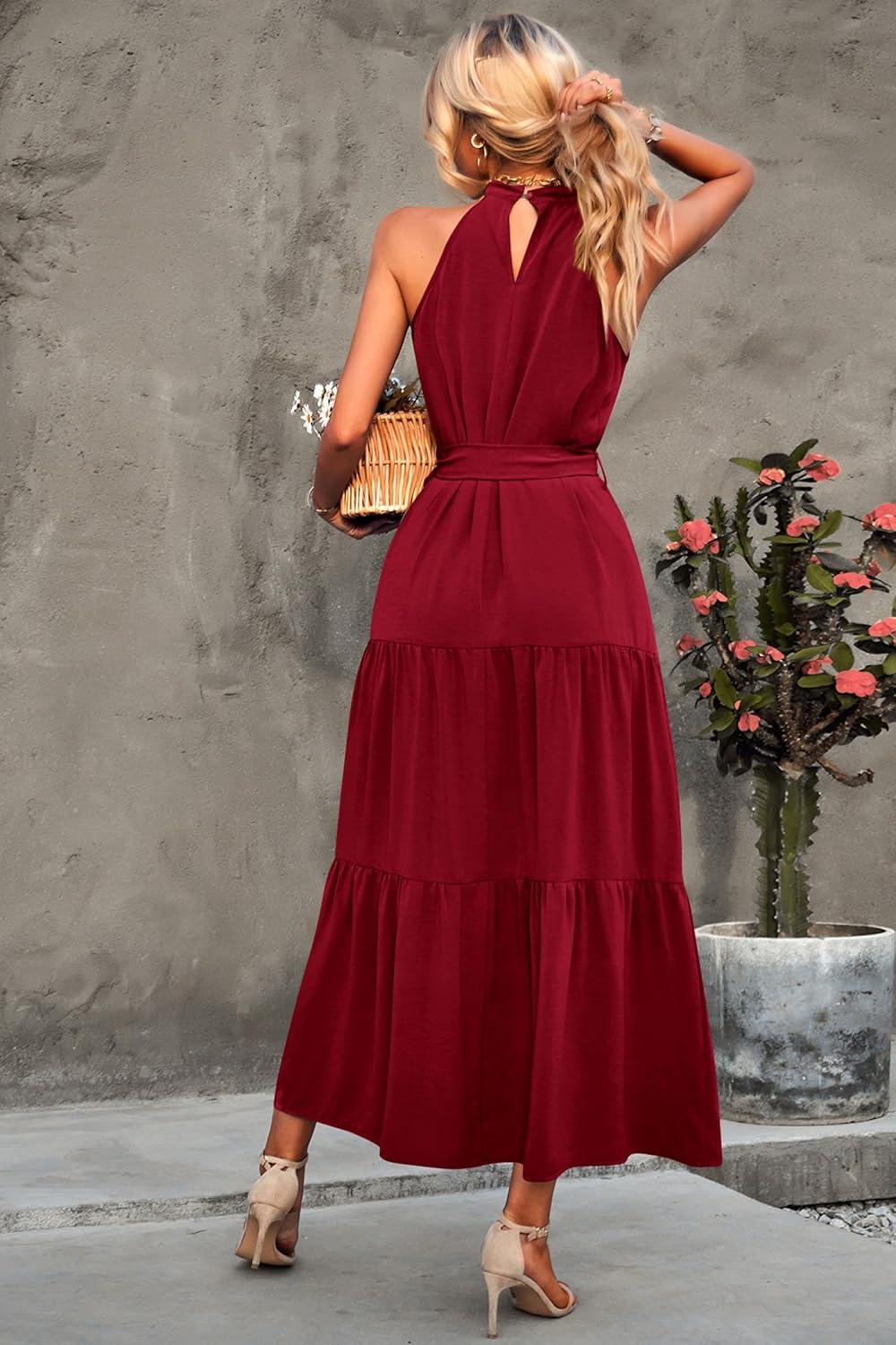 imagePRETTYGARDEN Womens Summer Floral Maxi Sun Dress Sleeveless Halter Neck Flowy Ruffle Hem Long Boho Dresses with BeltSolid Wine Red