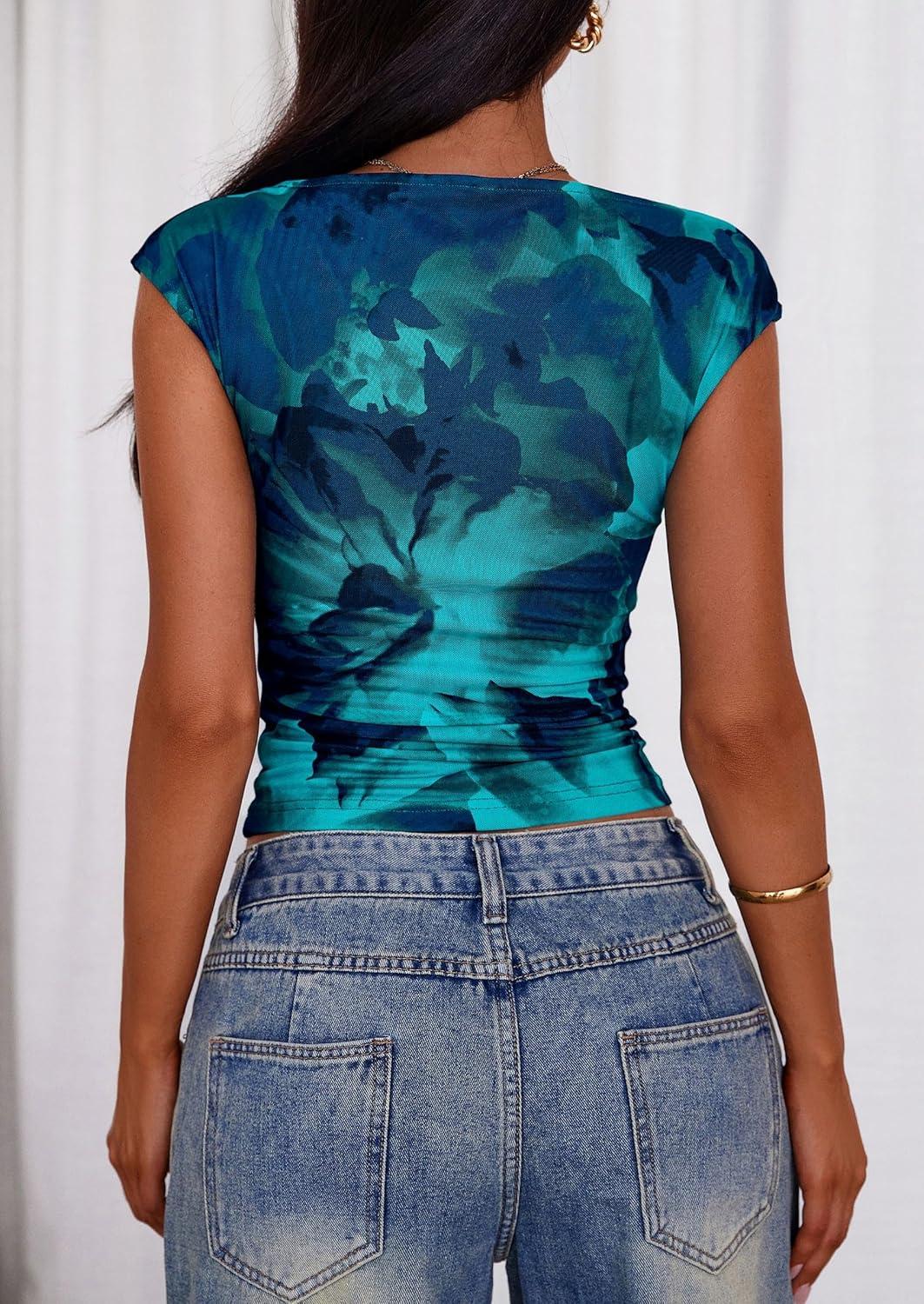 PRETTYGARDEN Women’s Summer Floral Mesh Tank Tops 2025 Trendy Casual Cap Sleeve Slim Fitted Blouse Shirt Going Out Outfits(Lake Blue)