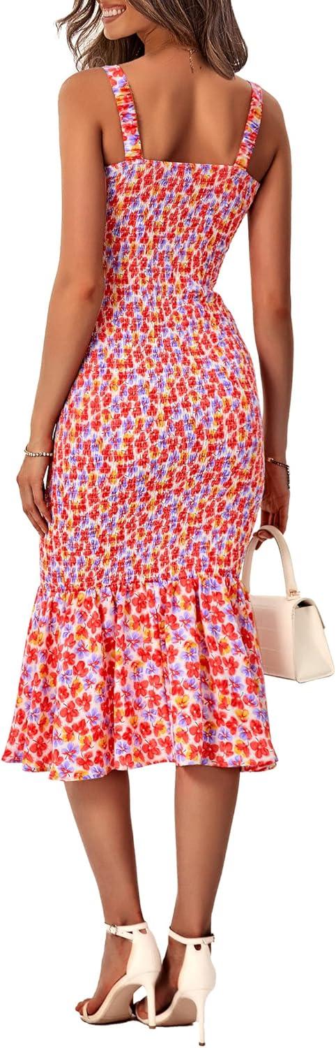 imagePRETTYGARDEN Womens Summer Floral Midi Tank Dress Sleeveless Strappy Ruffle Hem Smocked Bodycon DressesPink Red Big Floral