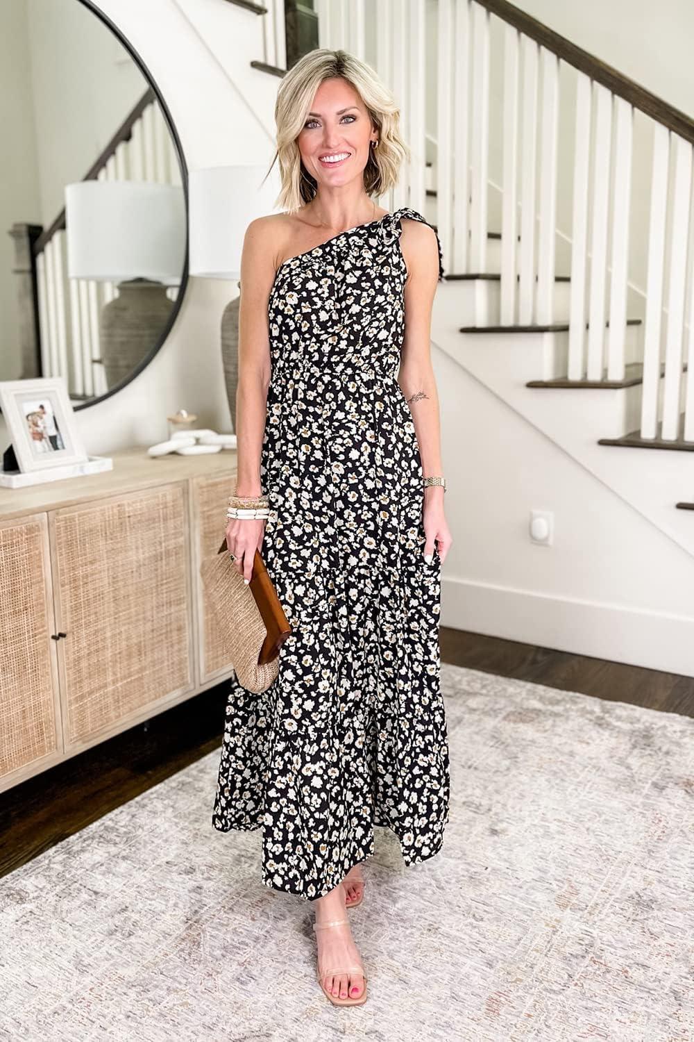 PRETTYGARDEN Women’s Summer Floral One Shoulder Maxi Dress Knot Ruffle Boho Beach Vacation Wedding Guest Long Dresses(Black White Floral)