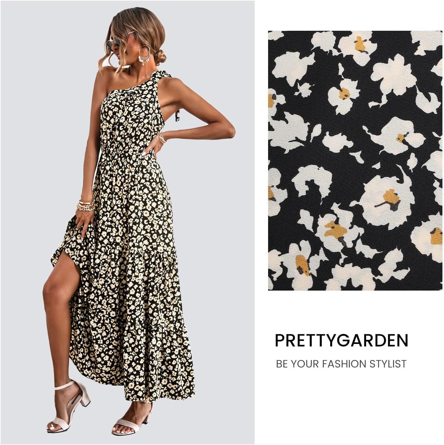 PRETTYGARDEN Women’s Summer Floral One Shoulder Maxi Dress Knot Ruffle Boho Beach Vacation Wedding Guest Long Dresses(Black/White/Yellow)