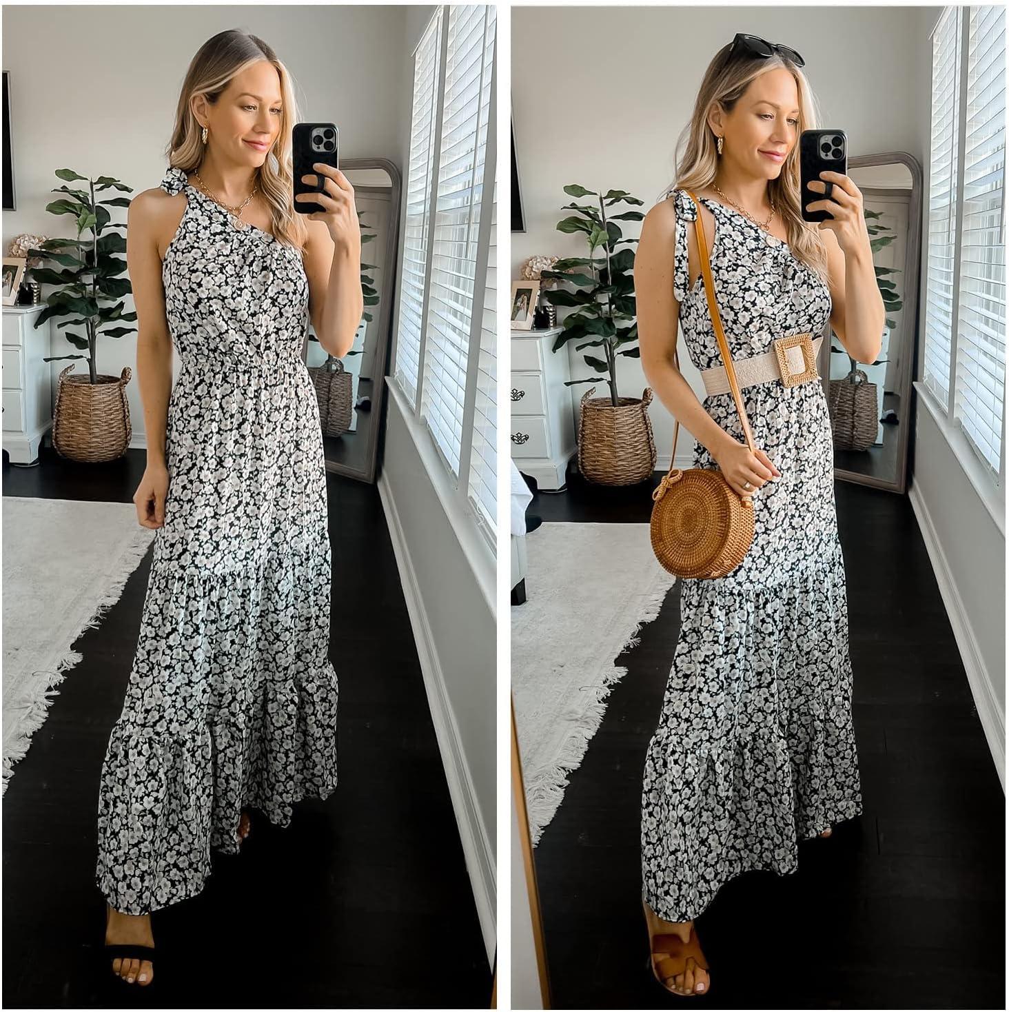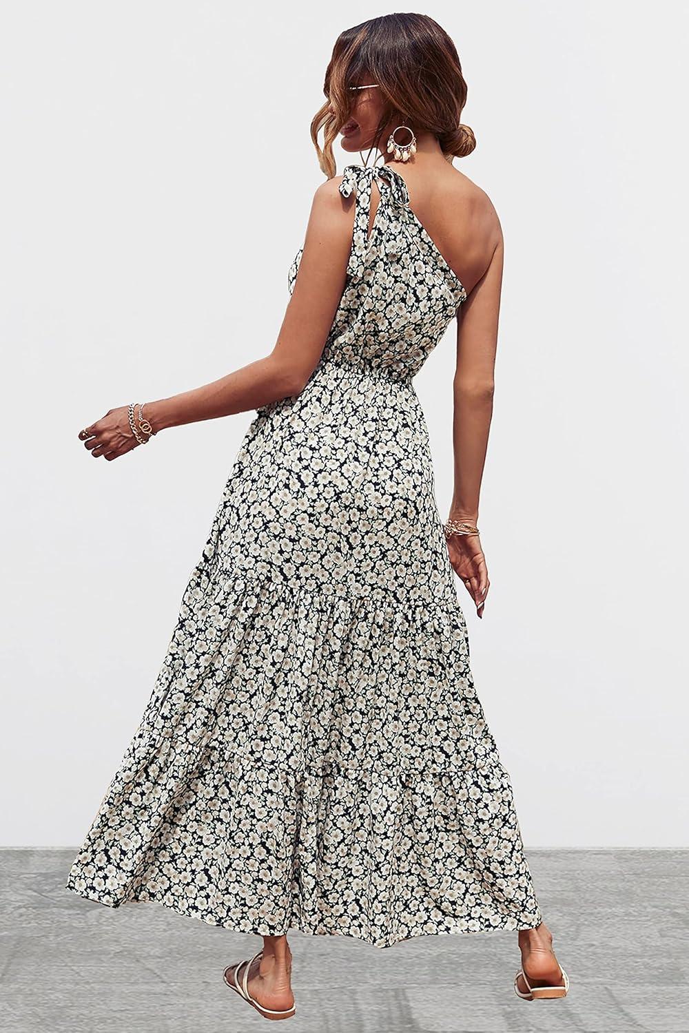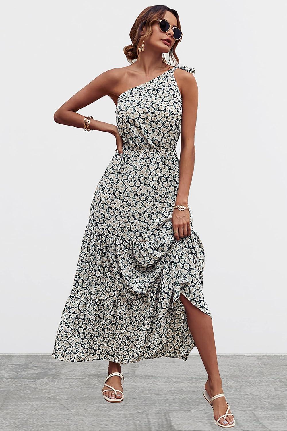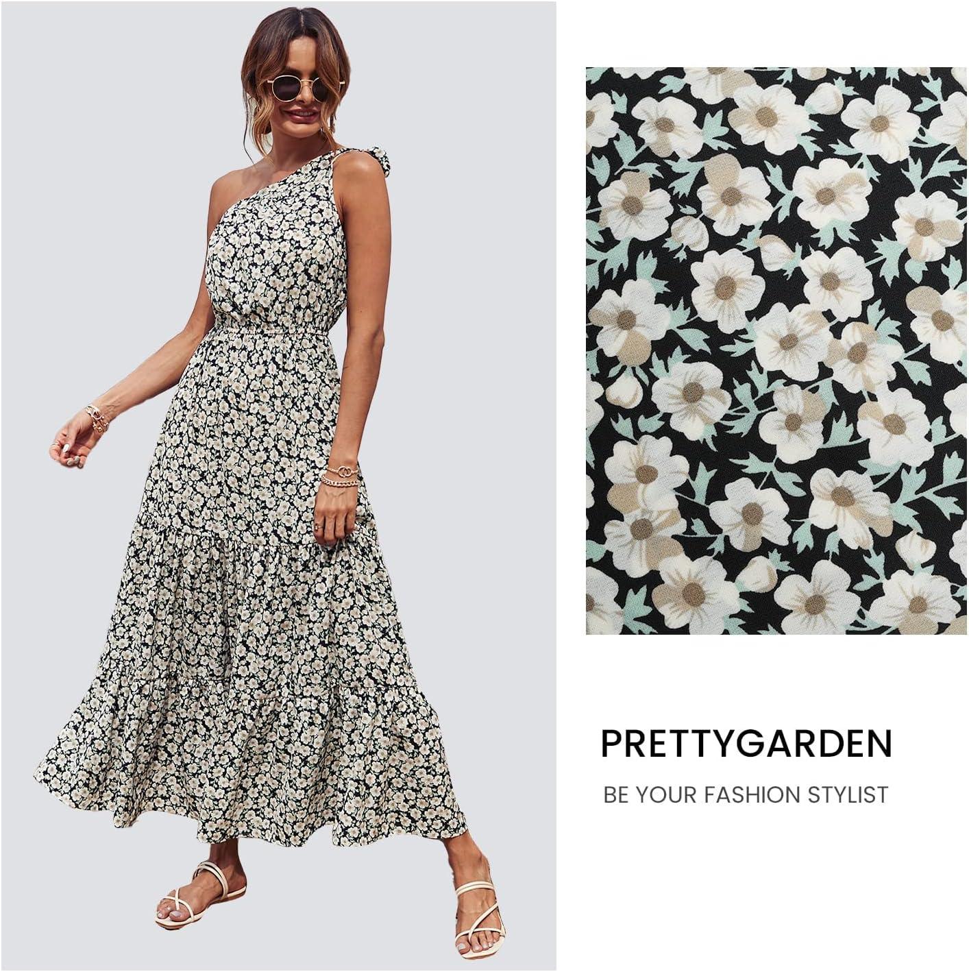 PRETTYGARDEN Women’s Summer Floral One Shoulder Maxi Dress Knot Ruffle Boho Beach Vacation Wedding Guest Long Dresses(Black White)