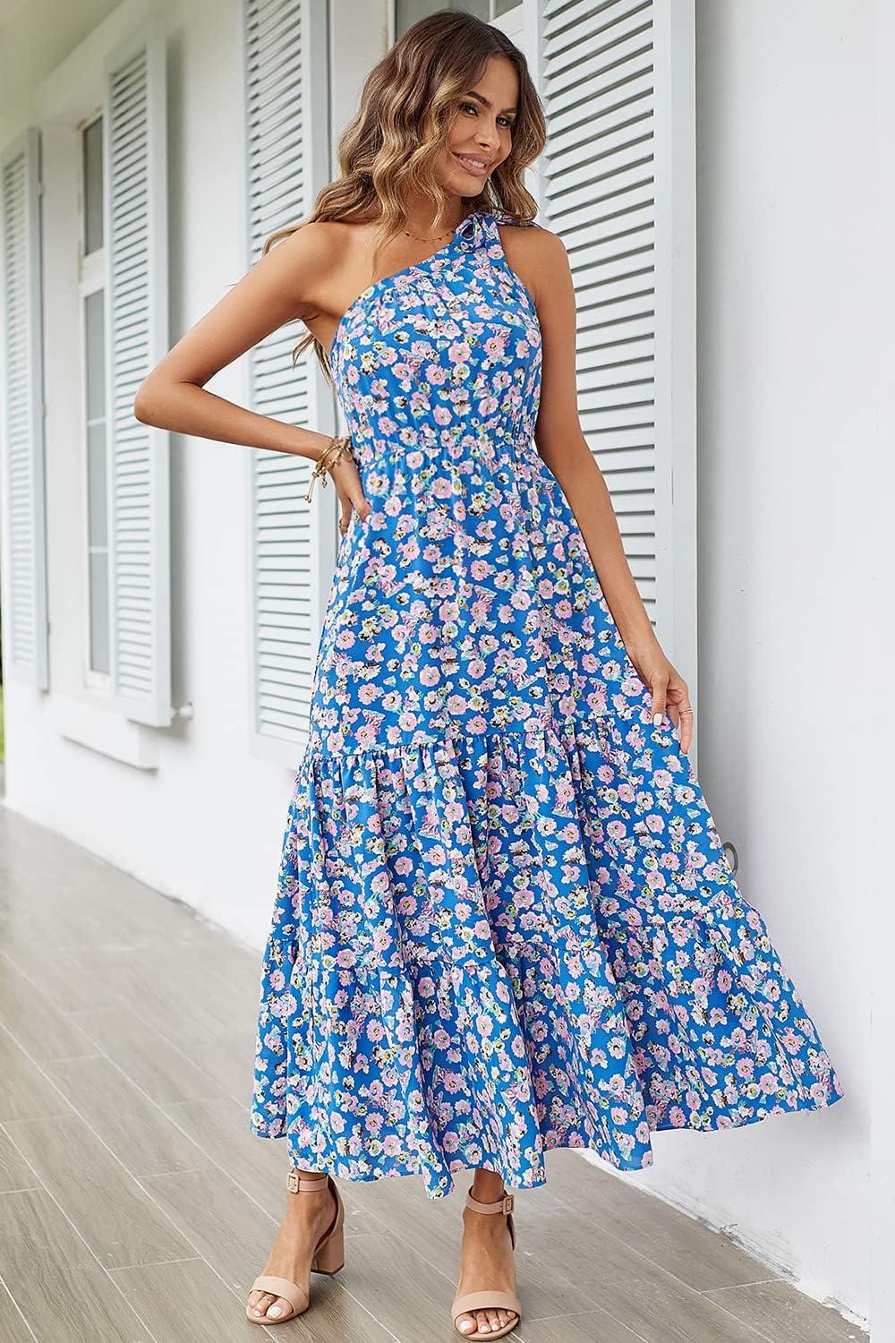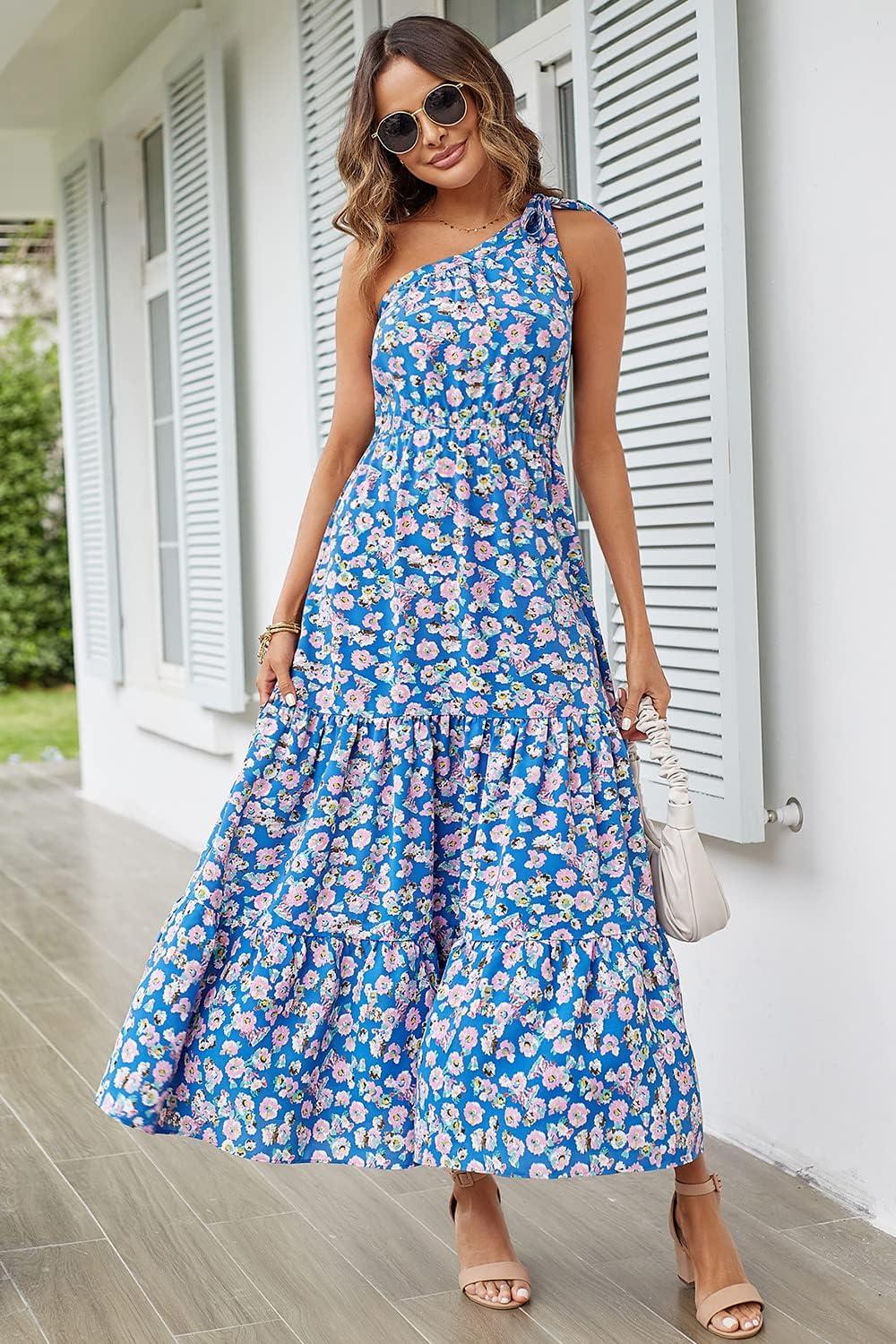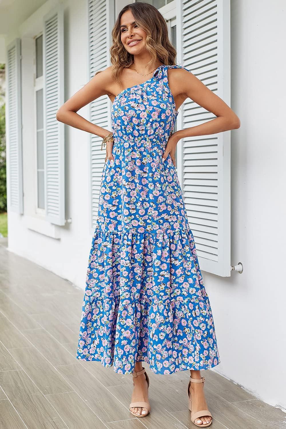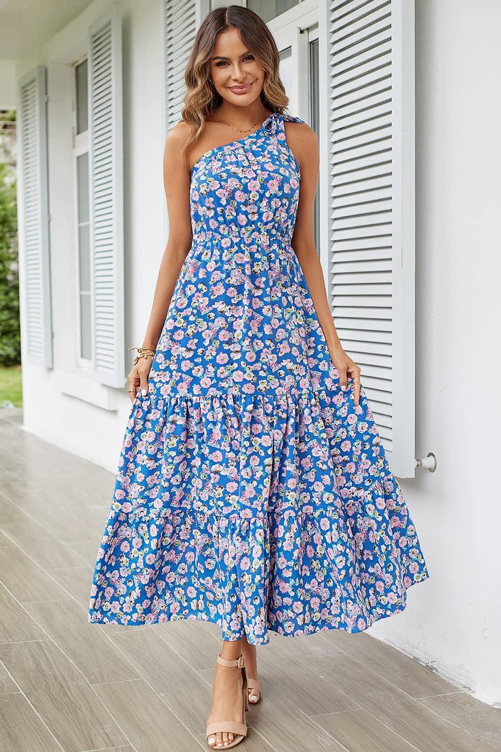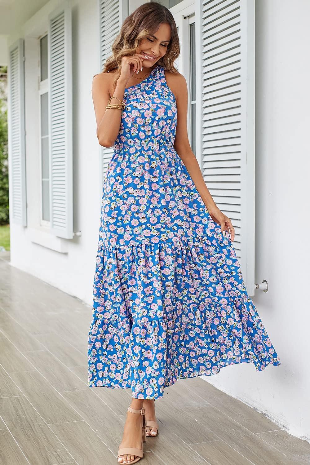 PRETTYGARDEN Women's Summer Floral One Shoulder Maxi Dress Knot Ruffle Boho Beach Vacation Wedding Guest Long Dresses(Blue Floral)