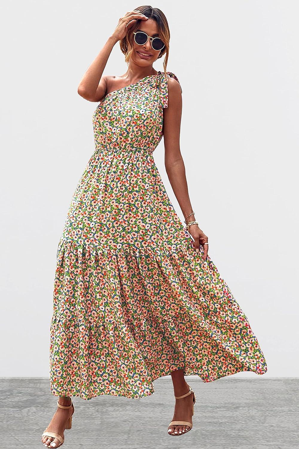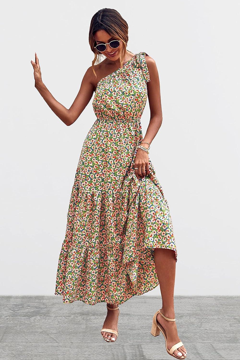 PRETTYGARDEN Women’s Summer Floral One Shoulder Maxi Dress Knot Ruffle Boho Beach Vacation Wedding Guest Long Dresses(Coffee)