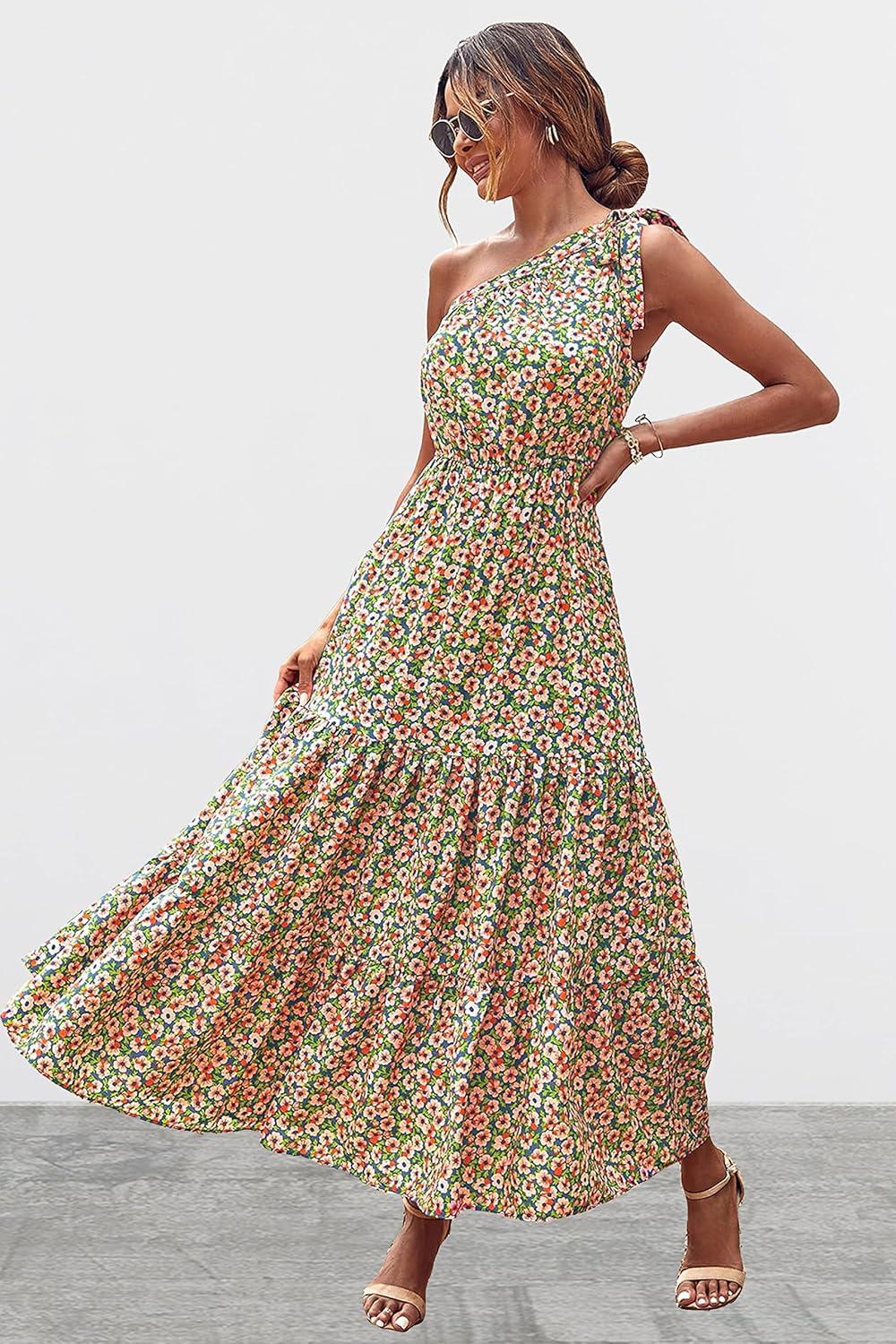 PRETTYGARDEN Women's Summer Floral One Shoulder Maxi Dress Knot Ruffle Boho Beach Vacation Wedding Guest Long Dresses(Blue/Pink)