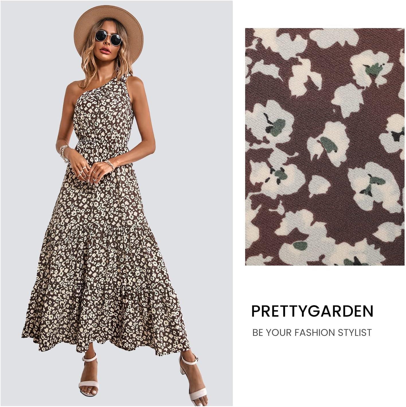 PRETTYGARDEN Women's Summer Floral One Shoulder Maxi Dress Knot Ruffle Boho Beach Vacation Wedding Guest Long Dresses(Coffee)