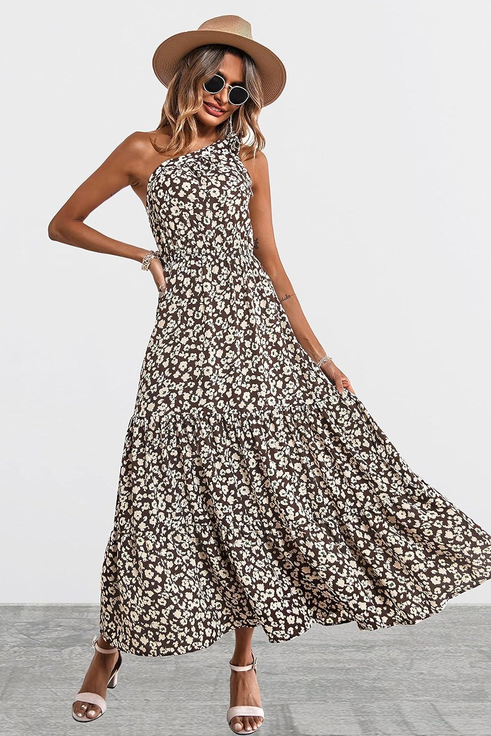 PRETTYGARDEN Women’s Summer Floral One Shoulder Maxi Dress Knot Ruffle Boho Beach Vacation Wedding Guest Long Dresses(Coffee)