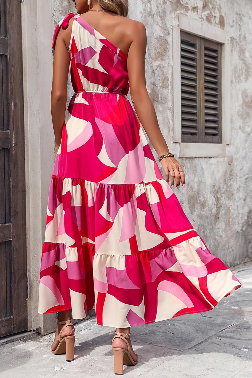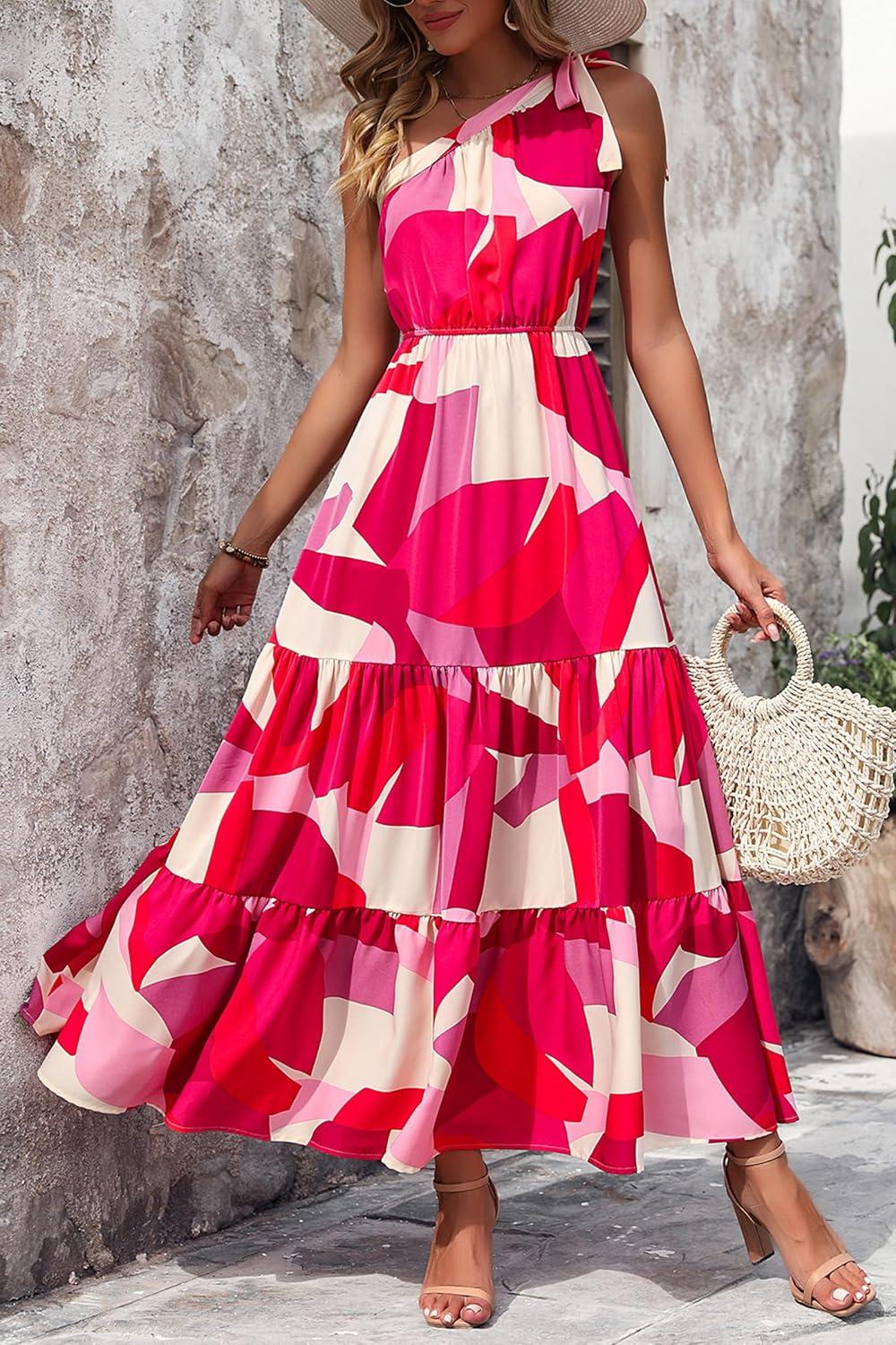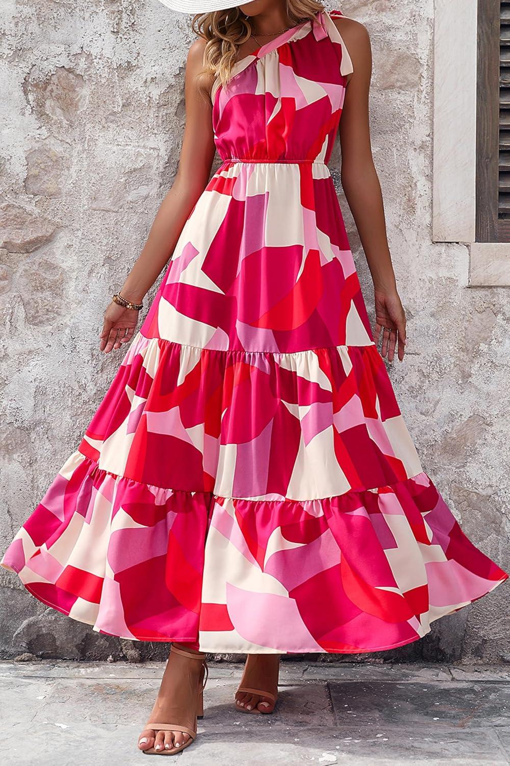 PRETTYGARDEN Women’s Summer Floral One Shoulder Maxi Dress Knot Ruffle Boho Beach Vacation Wedding Guest Long Dresses(Red White Block)