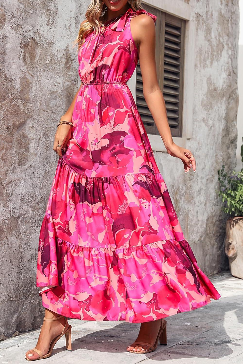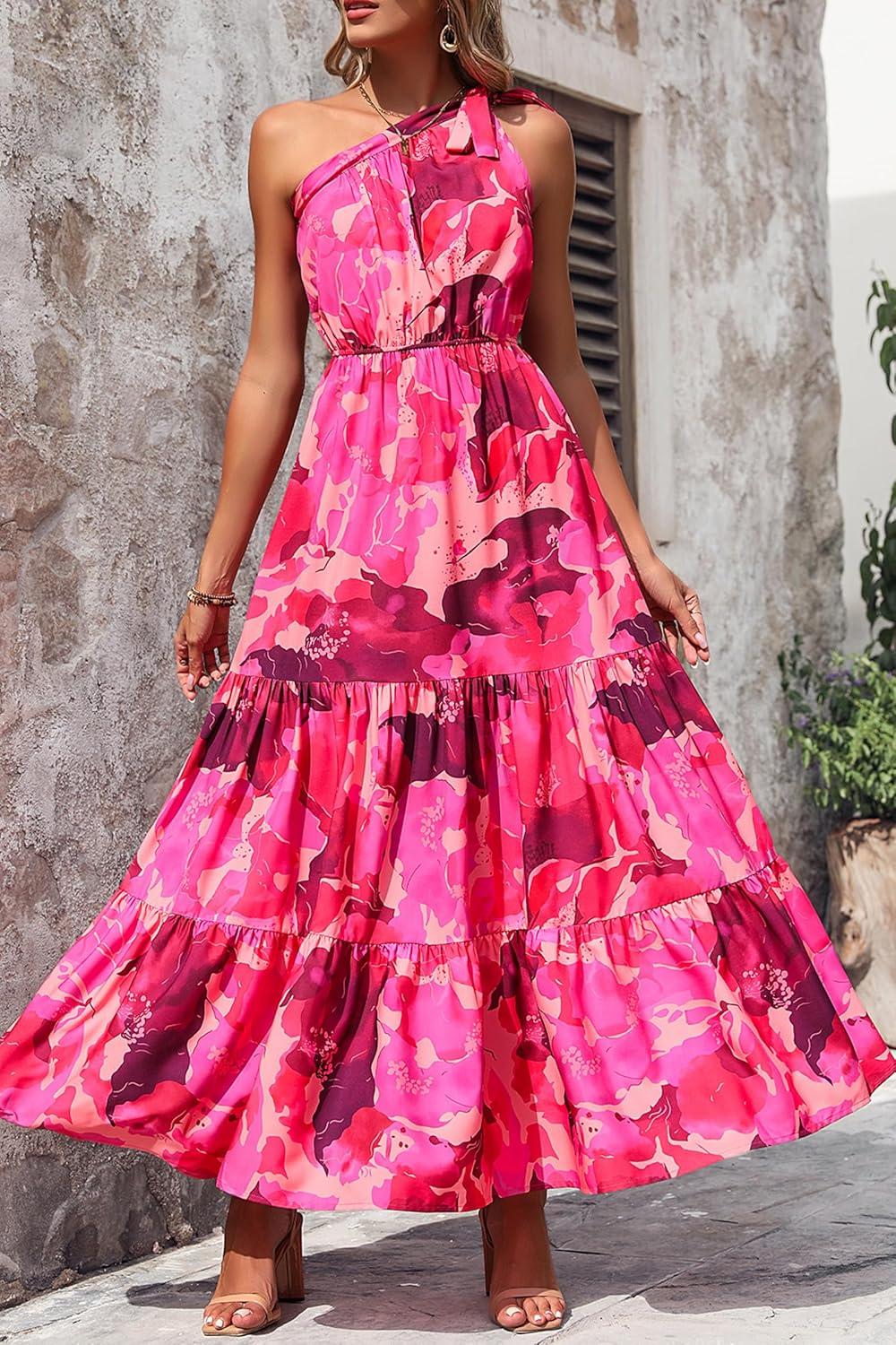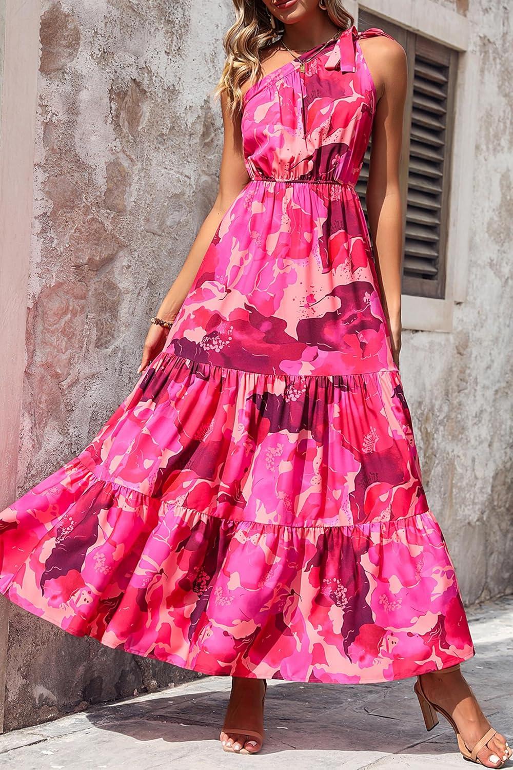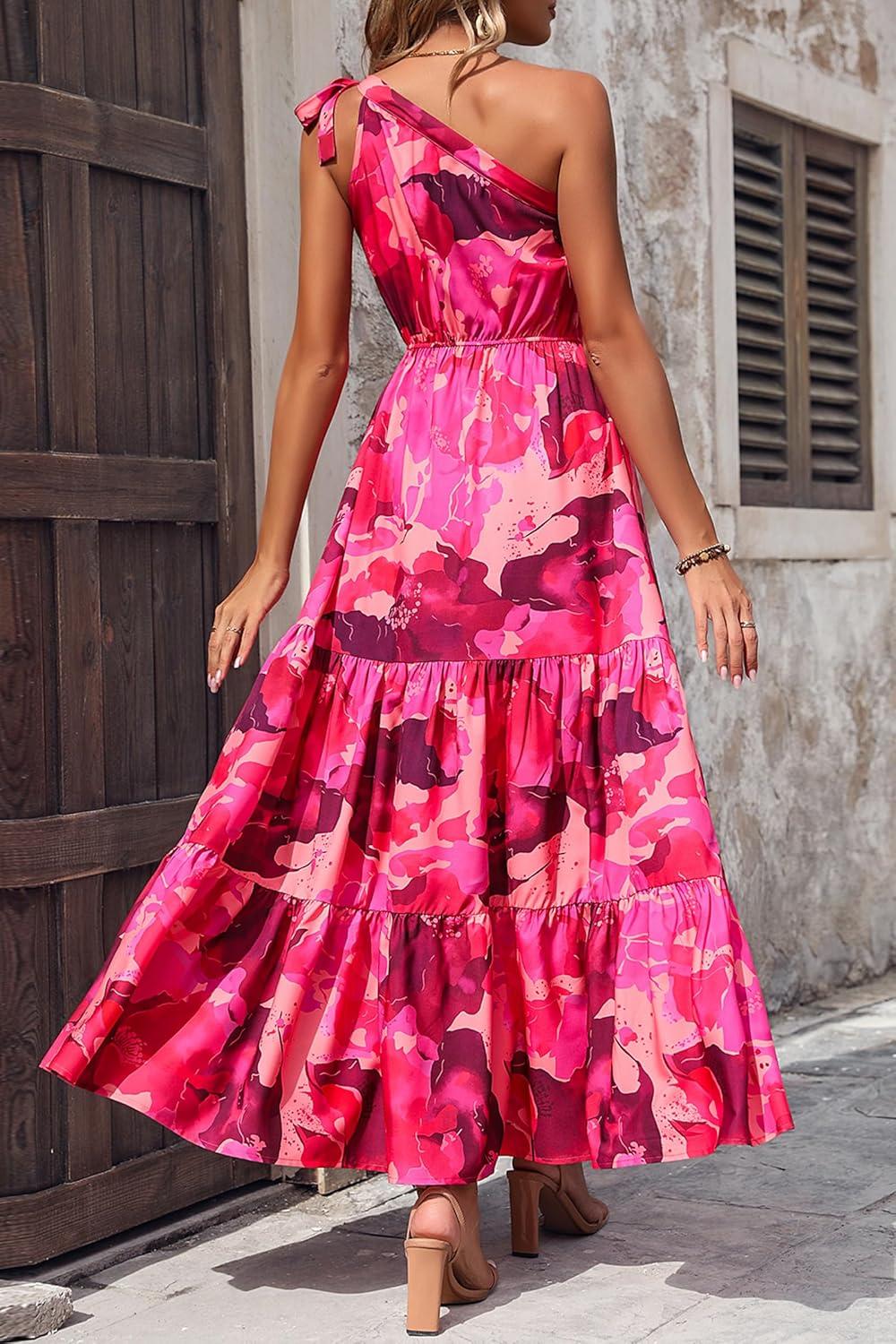 PRETTYGARDEN Women's Summer Floral One Shoulder Maxi Dress Knot Ruffle Boho Beach Vacation Wedding Guest Long Dresses(Rose Red Big Floral)