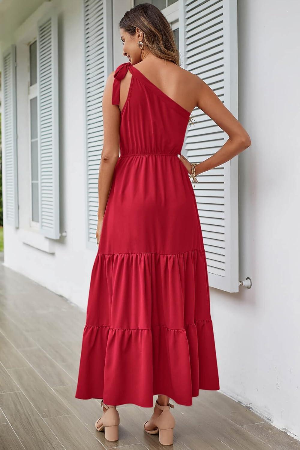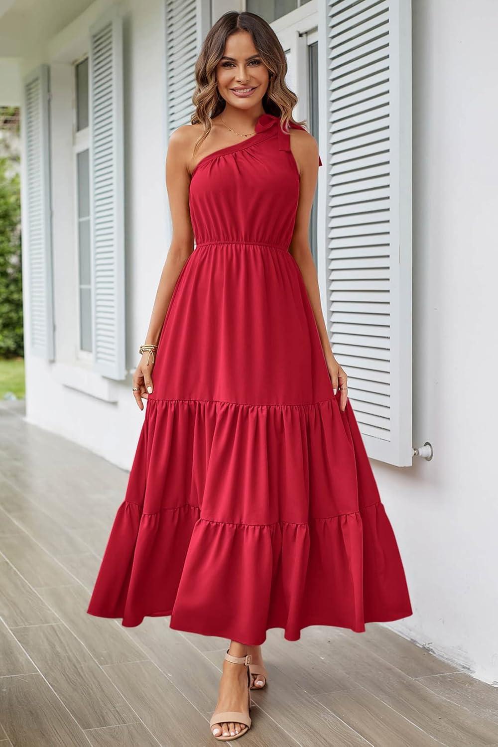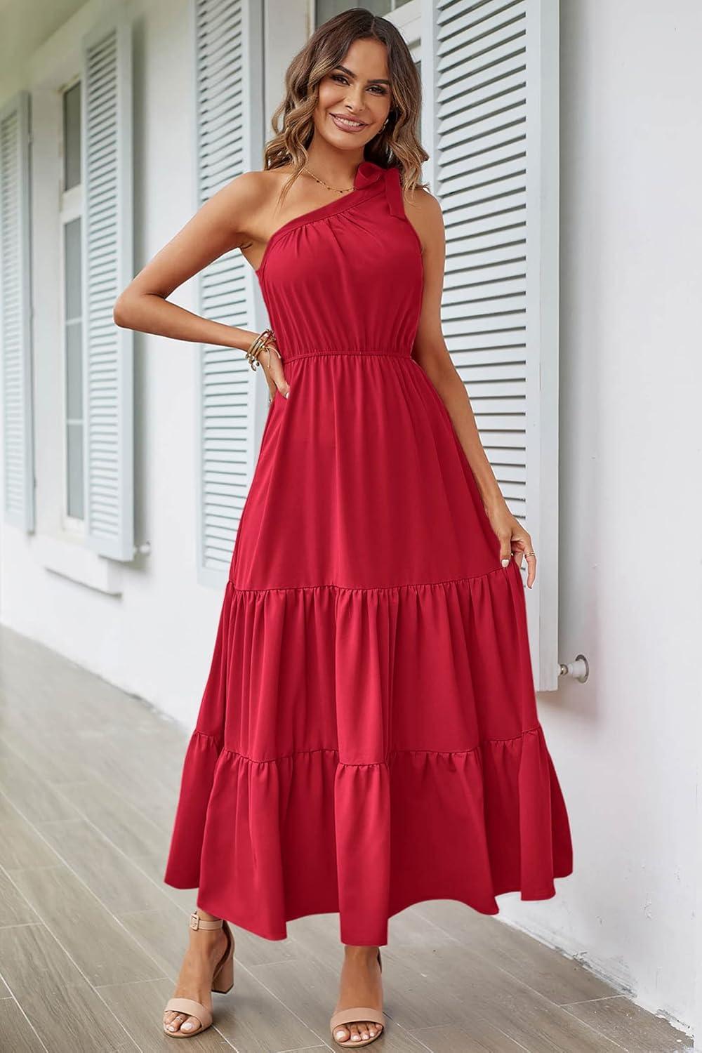 imagePRETTYGARDEN Womens Summer Floral One Shoulder Maxi Dress Knot Ruffle Boho Beach Vacation Wedding Guest Long DressesSolid Red