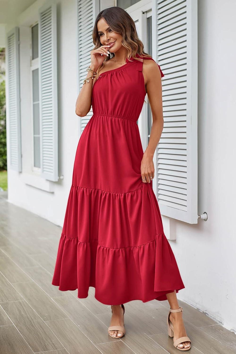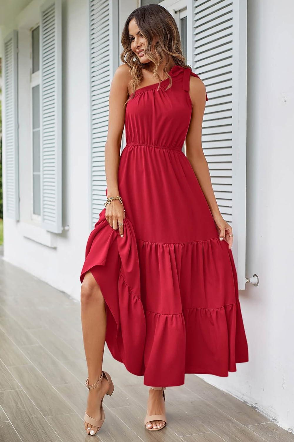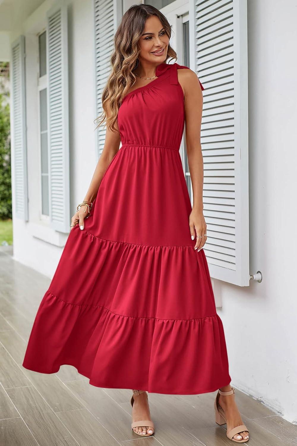 imagePRETTYGARDEN Womens Summer Floral One Shoulder Maxi Dress Knot Ruffle Boho Beach Vacation Wedding Guest Long DressesSolid Red