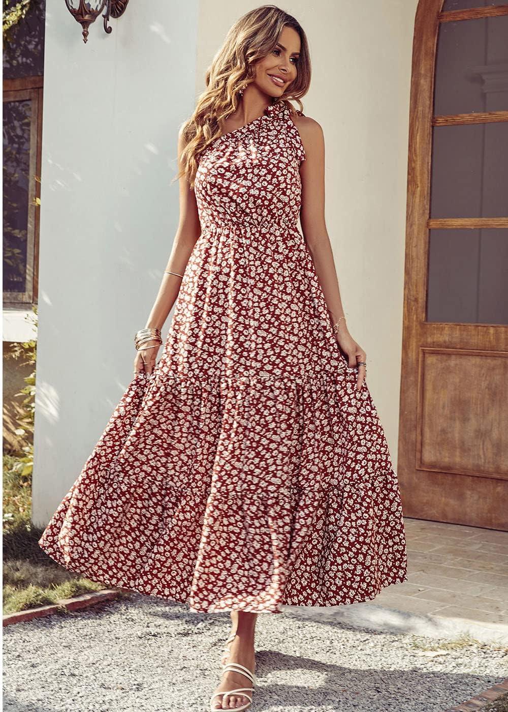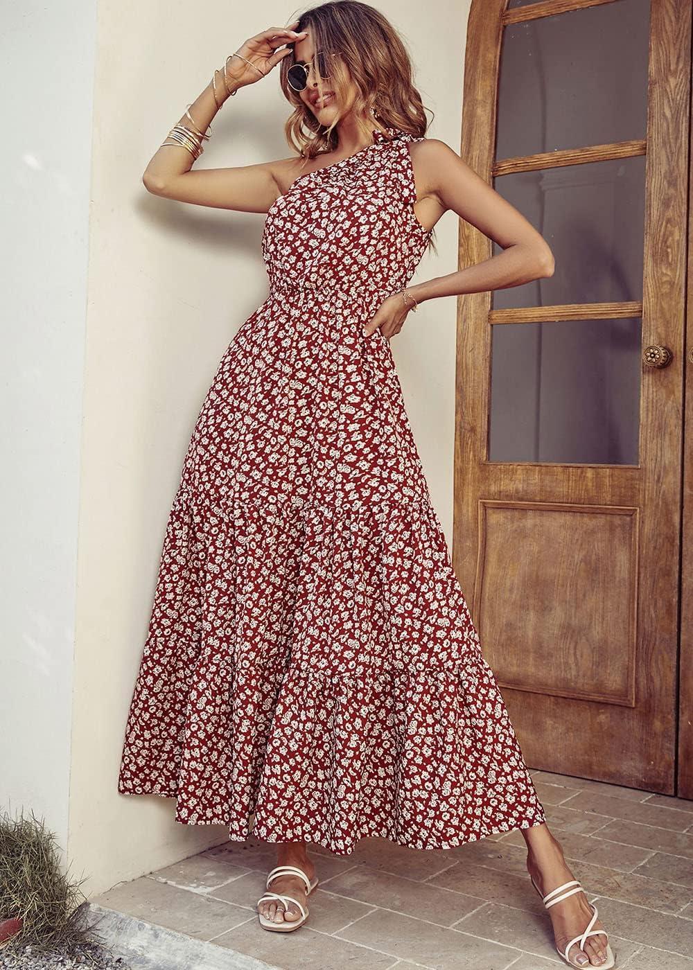 PRETTYGARDEN Women's Summer Floral One Shoulder Maxi Dress Knot Ruffle Boho Beach Vacation Wedding Guest Long Dresses(Wine Red)