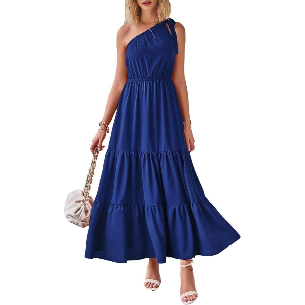 imagePRETTYGARDEN Womens Summer Floral One Shoulder Maxi Dress Knot Ruffle Boho Beach Vacation Wedding Guest Long Sun DressesSolid Royal Blue